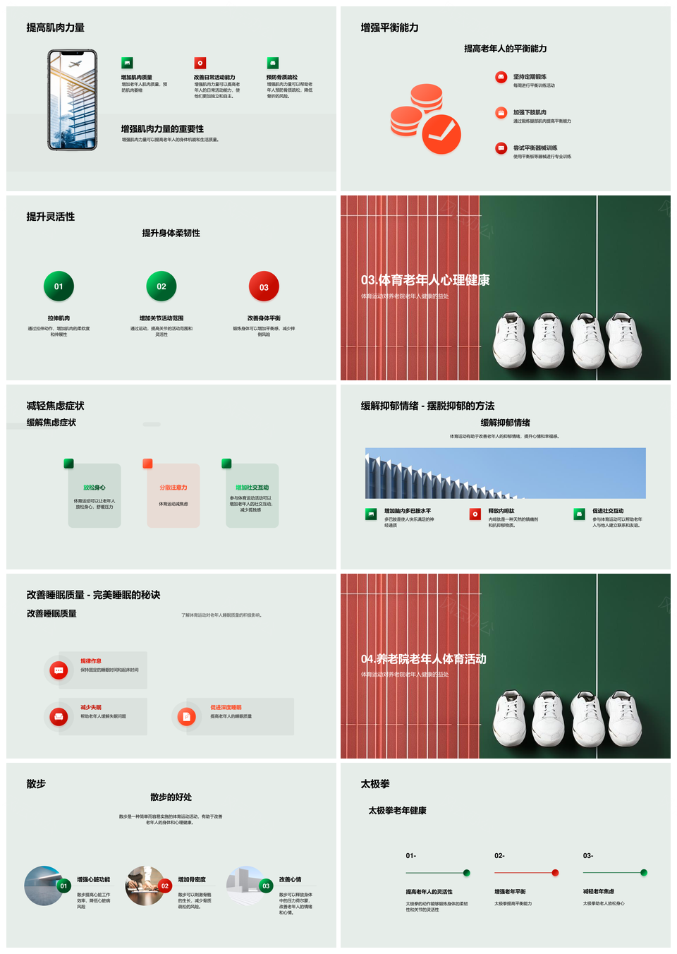 这是一张老年人运动强肌增灵活缓焦虑促健康PPT模板,包含老年人、运动、强肌、增灵活、缓焦虑、促健康等主题内容,也可用作老年人运动强肌增灵活、运动强肌增灵活缓焦虑、强肌增灵活缓焦虑促健康、老年人运动强肌、运动强肌增灵活、强肌增灵活缓焦虑、增灵活缓焦虑促健康、老年人运动、运动强肌、强肌增灵活、增灵活缓焦虑、缓焦虑促健康、运动促健康、增灵活促健康、强肌促健康等PPT场景使用。