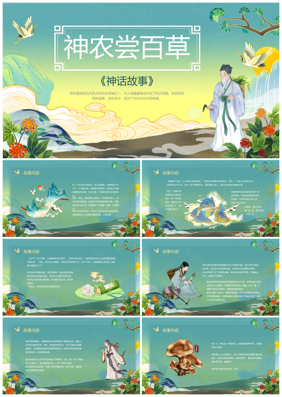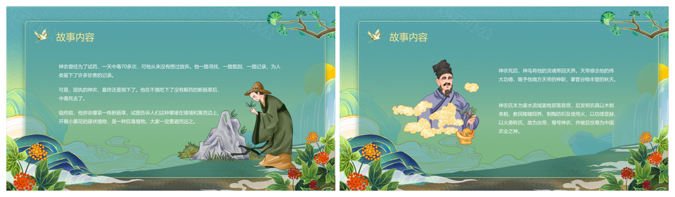 2025国潮绿黄卡通插画神农尝百草神话动态PPT模板