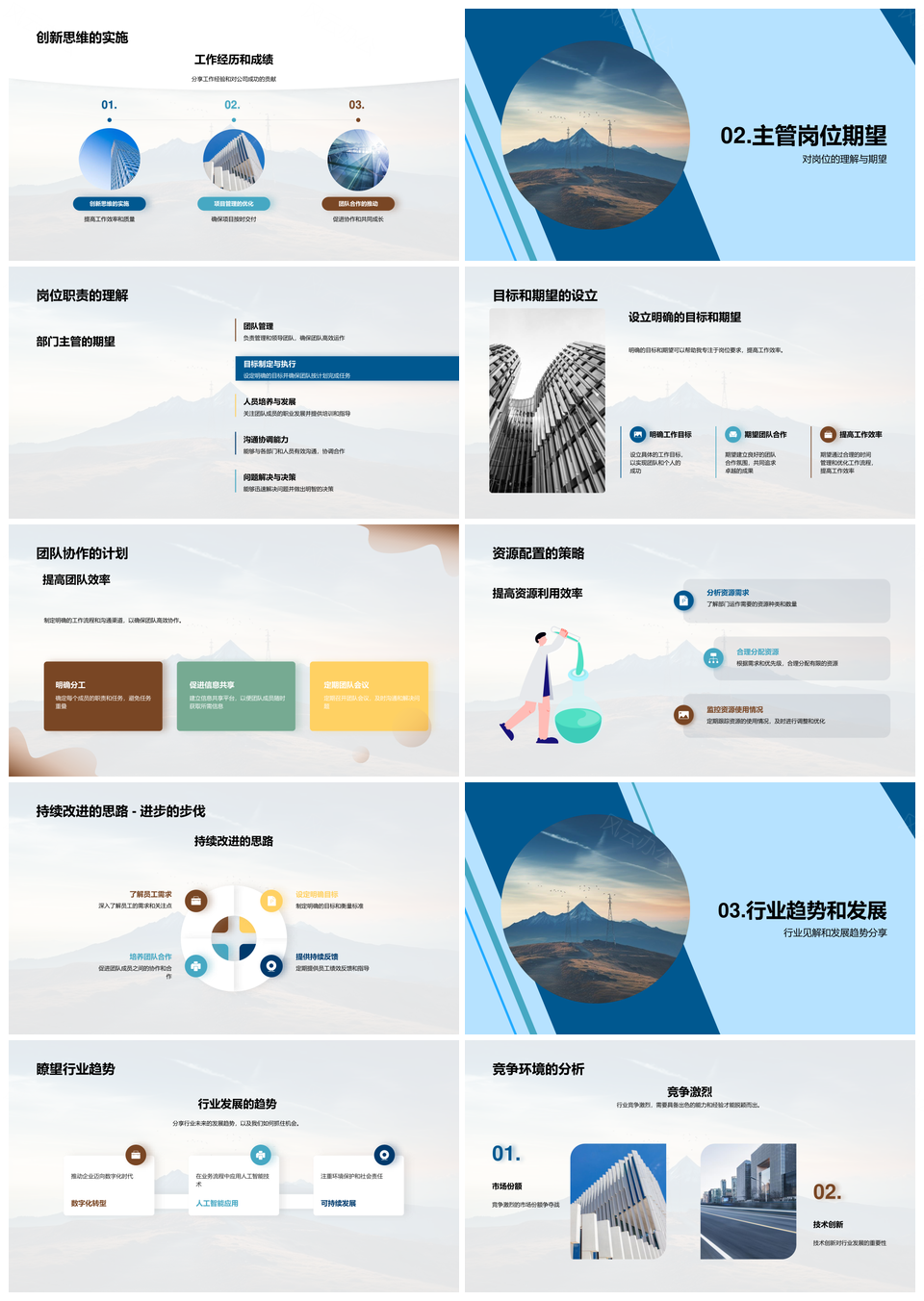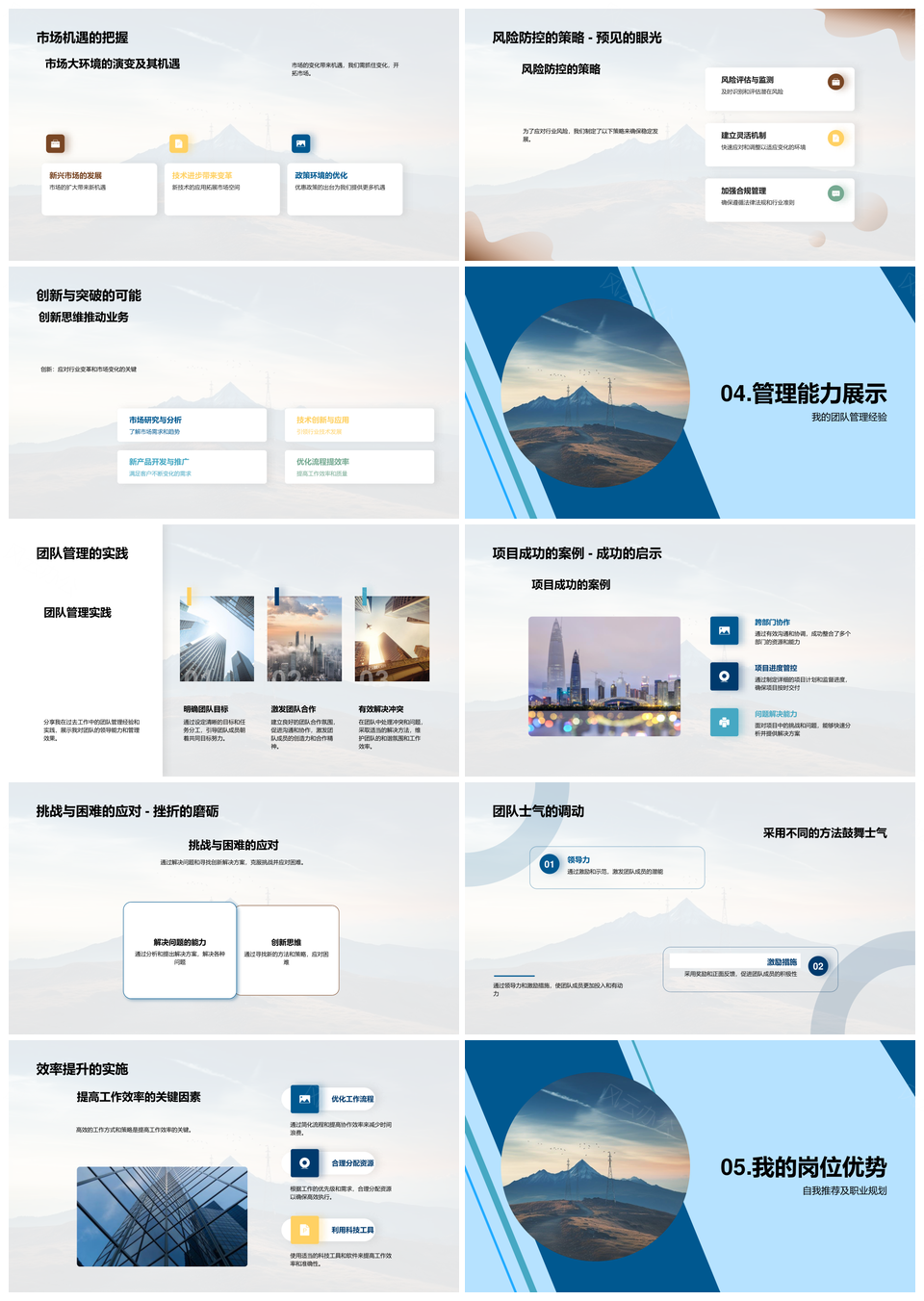 这是一张部门主管竞聘挑战项目管理带团队职责趋势路标PPT模板,包含部门主管、竞聘、挑战、项目管理、带团队、职责、趋势、路标等主题内容,也可用作部门主管竞聘挑战项目管理、部门主管项目管理带团队职责、竞聘挑战项目管理带团队、挑战项目管理带团队职责、部门主管职责趋势路标、项目管理带团队职责趋势、竞聘挑战职责趋势路标、带团队职责趋势路标、部门主管竞聘项目管理、挑战项目管理职责趋势、部门主管带团队职责、项目管理职责趋势路标、竞聘挑战项目管理、职责趋势路标部门主管、趋势路标项目管理职责等PPT场景使用。 风云办公提供的部门主管竞聘挑战项目管理带团队职责趋势路标PPT模板,下载格式为pptx,一共33页,作品中文字及图均可以修改和编辑,图片更改请在作品中右键图片并更换,文字修改请直接点击文字进行修改。