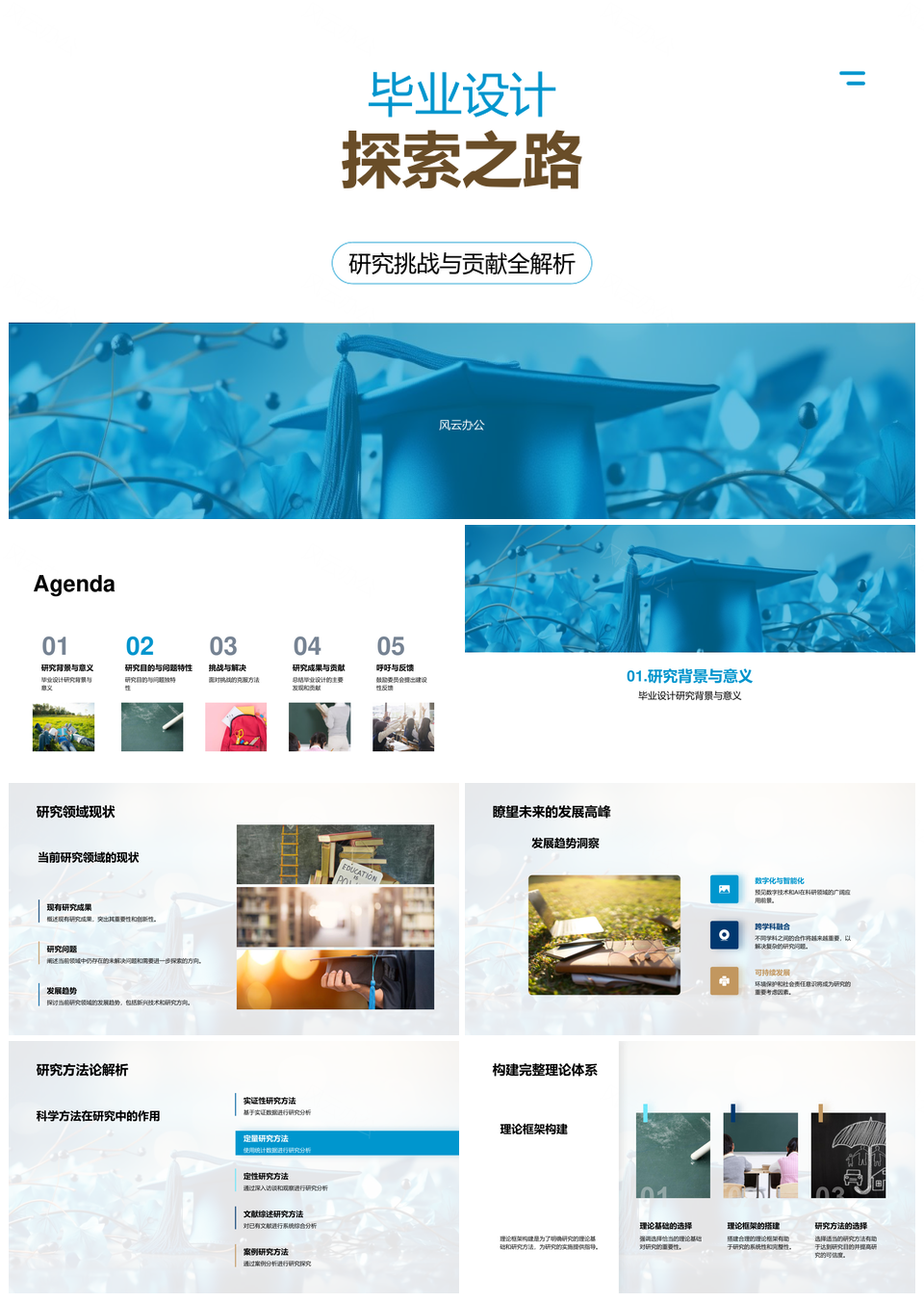 风云办公提供的毕业设计研究挑战贡献背景趋势探析PPT模板,下载格式为pptx,一共25页,作品中文字及图均可以修改和编辑,图片更改请在作品中右键图片并更换,文字修改请直接点击文字进行修改。