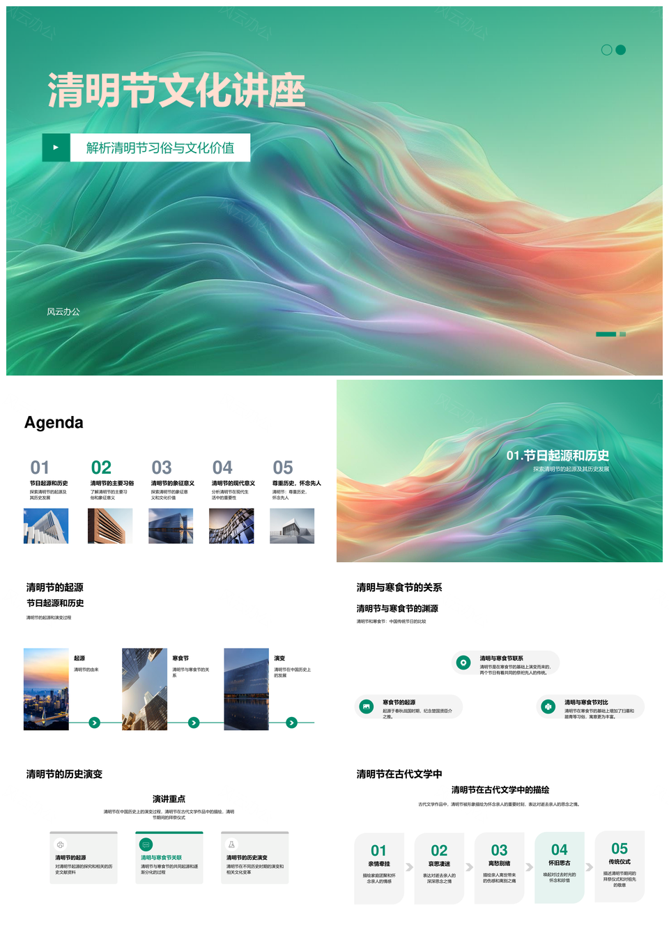 风云办公提供的清明节寒食起源演变与习俗文化探析PPT模板,下载格式为pptx,一共28页,作品中文字及图均可以修改和编辑,图片更改请在作品中右键图片并更换,文字修改请直接点击文字进行修改。