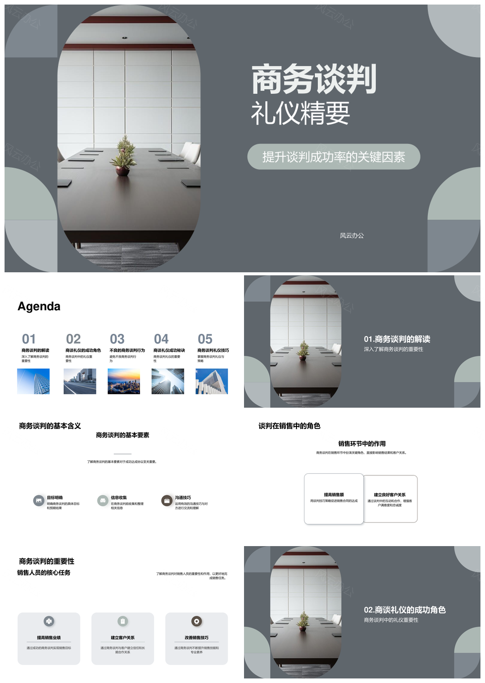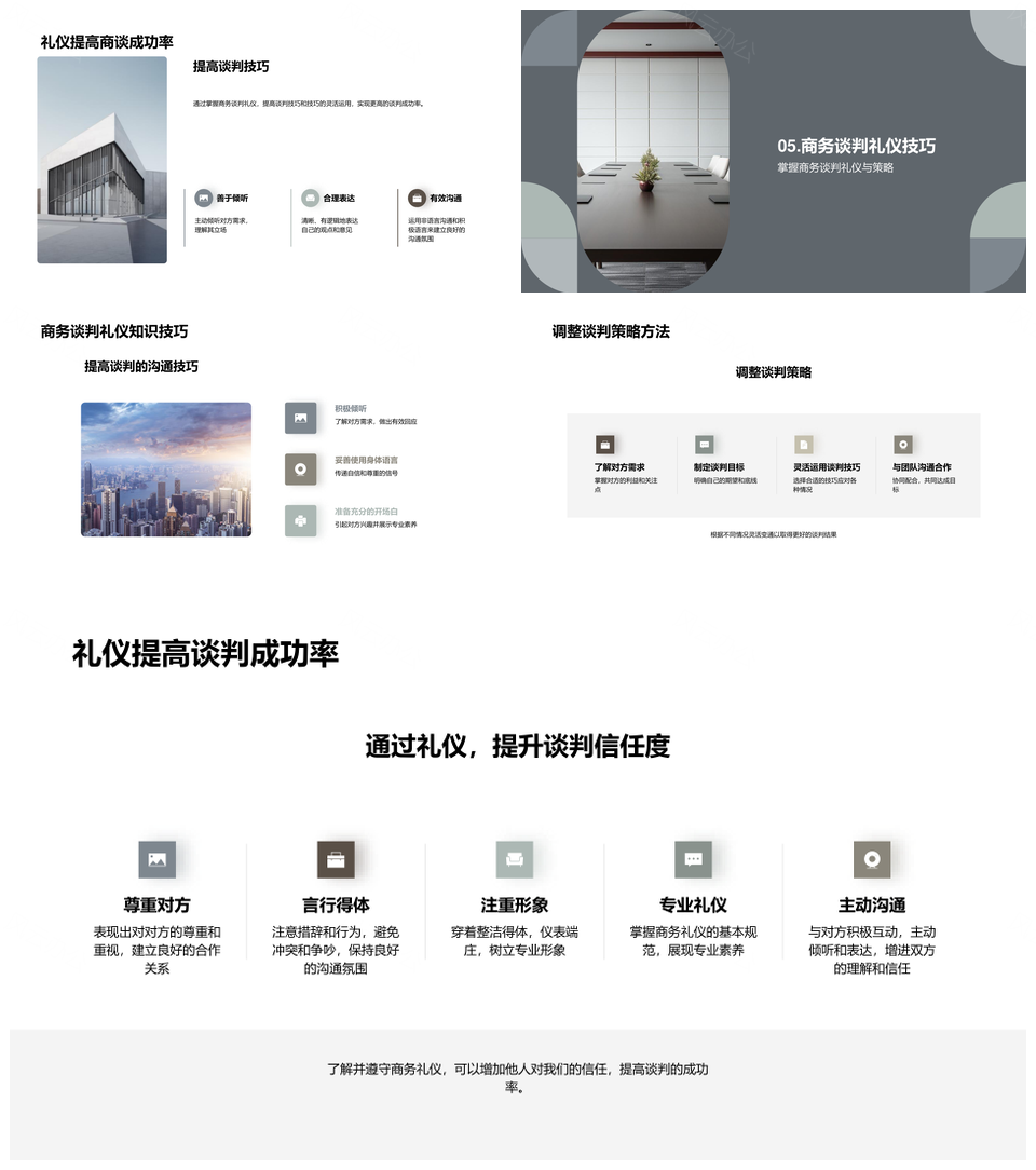 这是一张商务谈判礼仪策略塑造形象提升销售成功率PPT模板,包含商务谈判、礼仪、策略、塑造、形象、提升、销售成功率等主题内容,也可用作商务谈判礼仪策略、谈判礼仪策略塑造、礼仪策略塑造形象、策略塑造形象提升、塑造形象提升销售、形象提升销售成功率、商务谈判礼仪、谈判礼仪策略、礼仪策略塑造、策略塑造形象、塑造形象提升、形象提升销售、提升销售成功率、商务谈判、谈判礼仪等PPT场景使用。 风云办公提供的商务谈判礼仪策略塑造形象提升销售成功率PPT模板,下载格式为pptx,一共23页,作品中文字及图均可以修改和编辑,图片更改请在作品中右键图片并更换,文字修改请直接点击文字进行修改。
