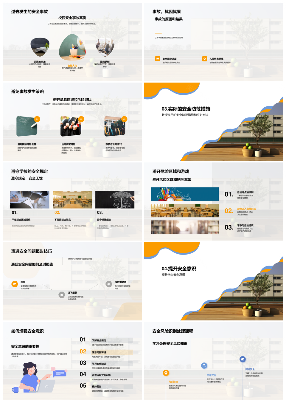 这是一张校园安全课堂强化学生安全意识校规PPT模板,包含校园、安全课堂、强化、学生、安全意识、校规等主题内容,也可用作校园安全课堂强化、校园安全课堂、校园安全、安全课堂强化、安全课堂、课堂强化学生、强化学生安全、强化学生、学生安全意识校规、学生安全意识、安全意识校规、安全意识、校规等PPT场景使用。 风云办公提供的校园安全课堂强化学生安全意识校规PPT模板,下载格式为pptx,一共23页,作品中文字及图均可以修改和编辑,图片更改请在作品中右键图片并更换,文字修改请直接点击文字进行修改。