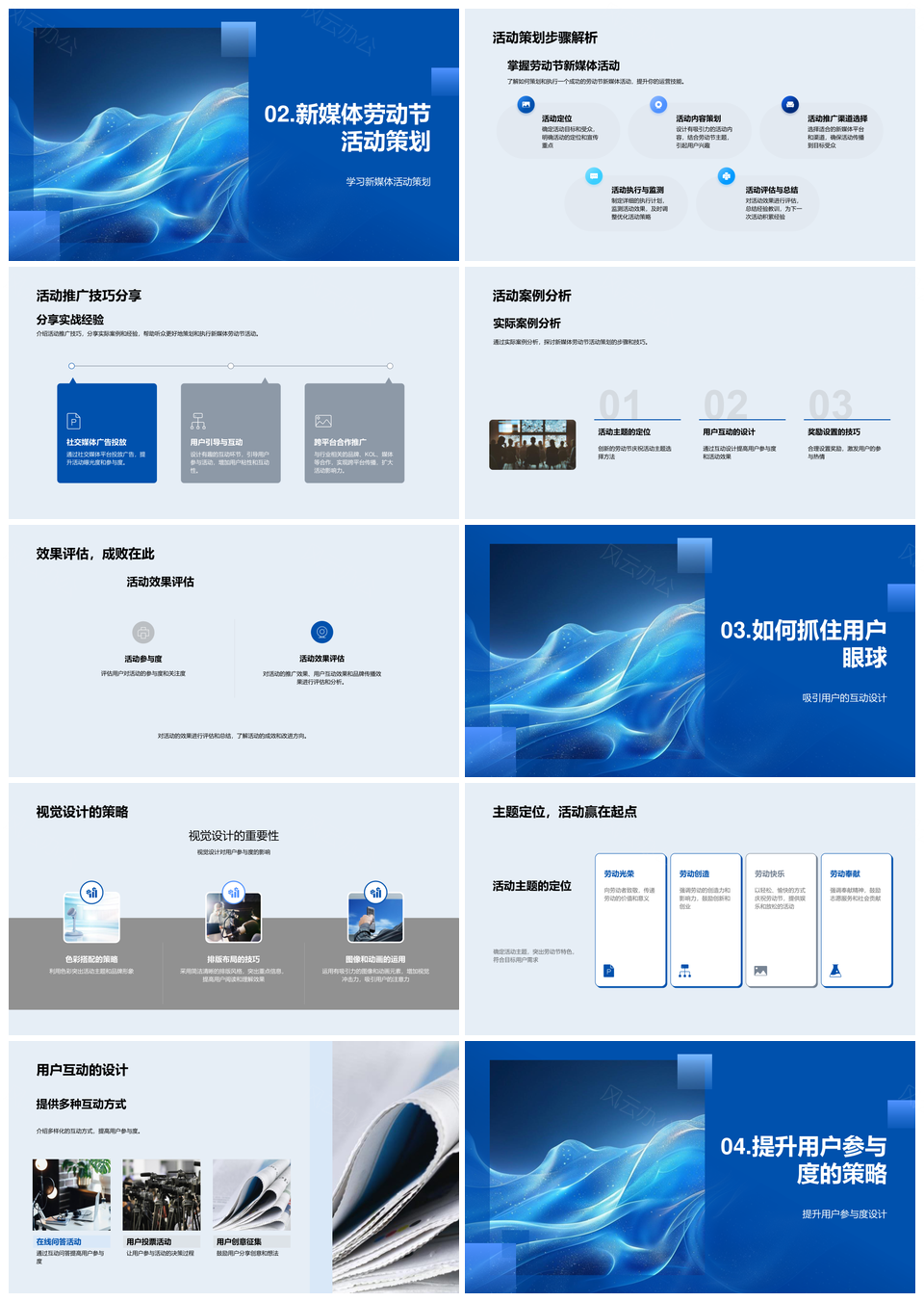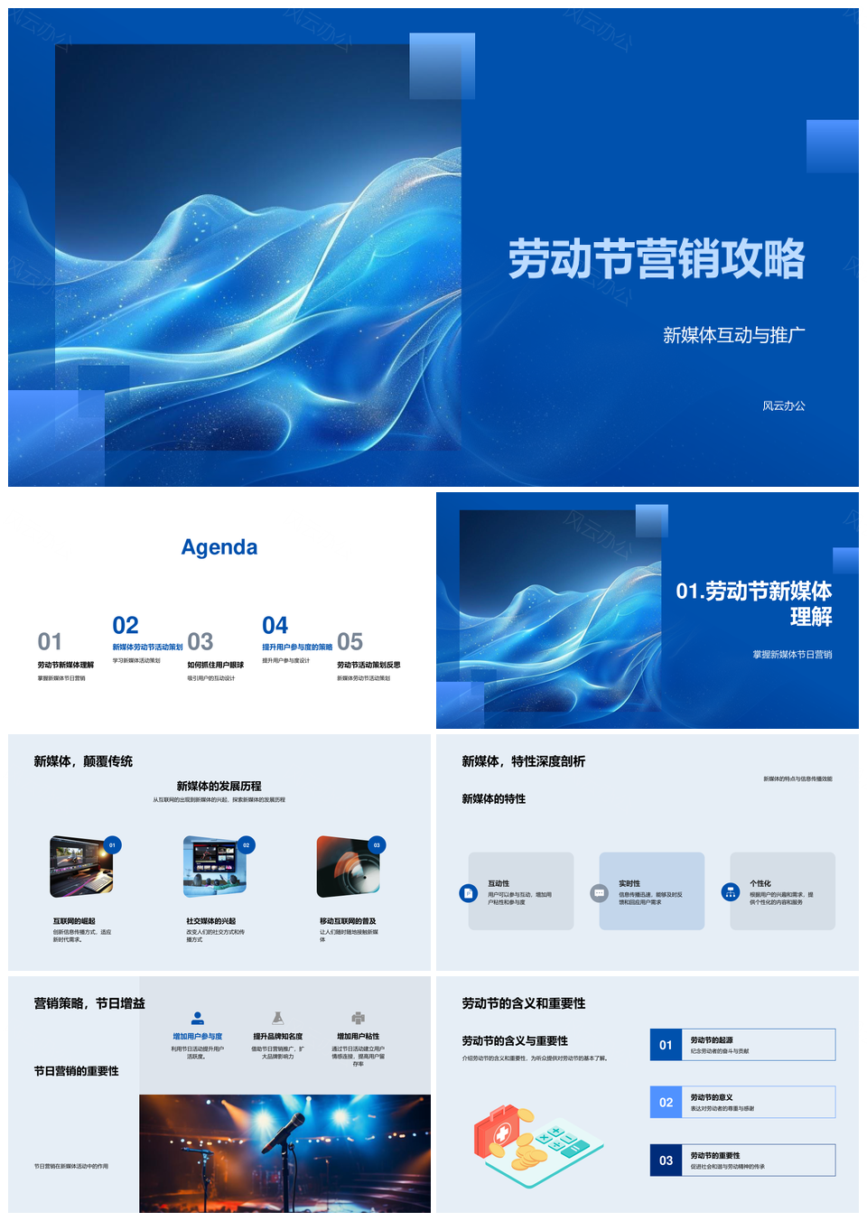 风云办公提供的劳动节新媒体营销活动策划PPT模板,下载格式为pptx,一共26页,作品中文字及图均可以修改和编辑,图片更改请在作品中右键图片并更换,文字修改请直接点击文字进行修改。