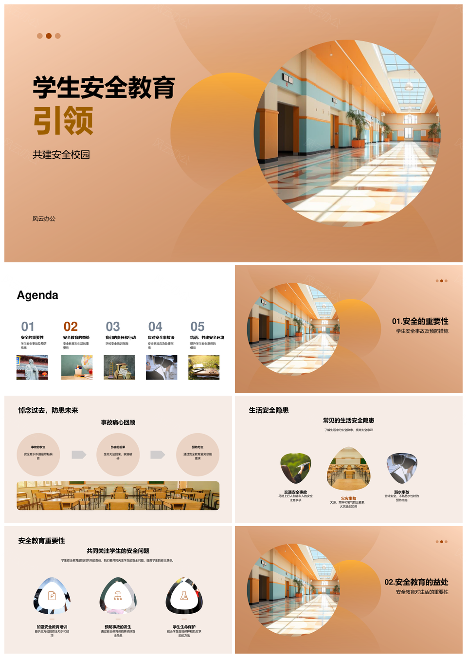 风云办公提供的学生安全教育引领校园安全共建活动PPT模板,下载格式为pptx,一共23页,作品中文字及图均可以修改和编辑,图片更改请在作品中右键图片并更换,文字修改请直接点击文字进行修改。