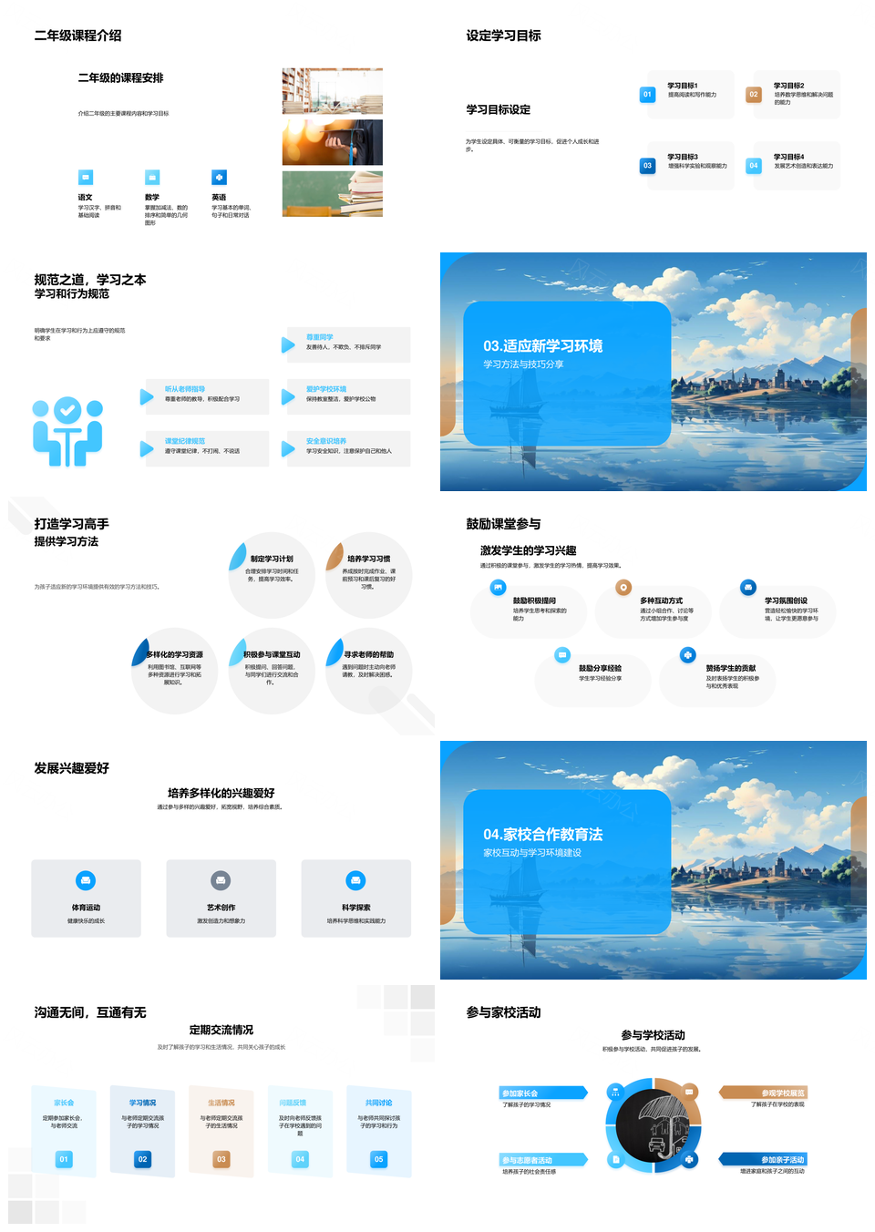 这是一张启航二年级家校合作课程目标规范适应回顾PPT模板,包含启航、二年级、家校合作、课程目标、规范、适应、回顾等主题内容,也可用作启航二年级家校合作课程目标、二年级家校合作课程目标规范、家校合作课程目标规范适应、课程目标规范适应回顾、启航二年级家校合作、二年级家校合作课程目标、家校合作课程目标规范、课程目标规范适应、规范适应回顾、启航二年级、二年级家校合作、家校合作课程目标、课程目标规范、规范适应、适应回顾等PPT场景使用。 风云办公提供的启航二年级家校合作课程目标规范适应回顾PPT模板,下载格式为pptx,一共23页,作品中文字及图均可以修改和编辑,图片更改请在作品中右键图片并更换,文字修改请直接点击文字进行修改。