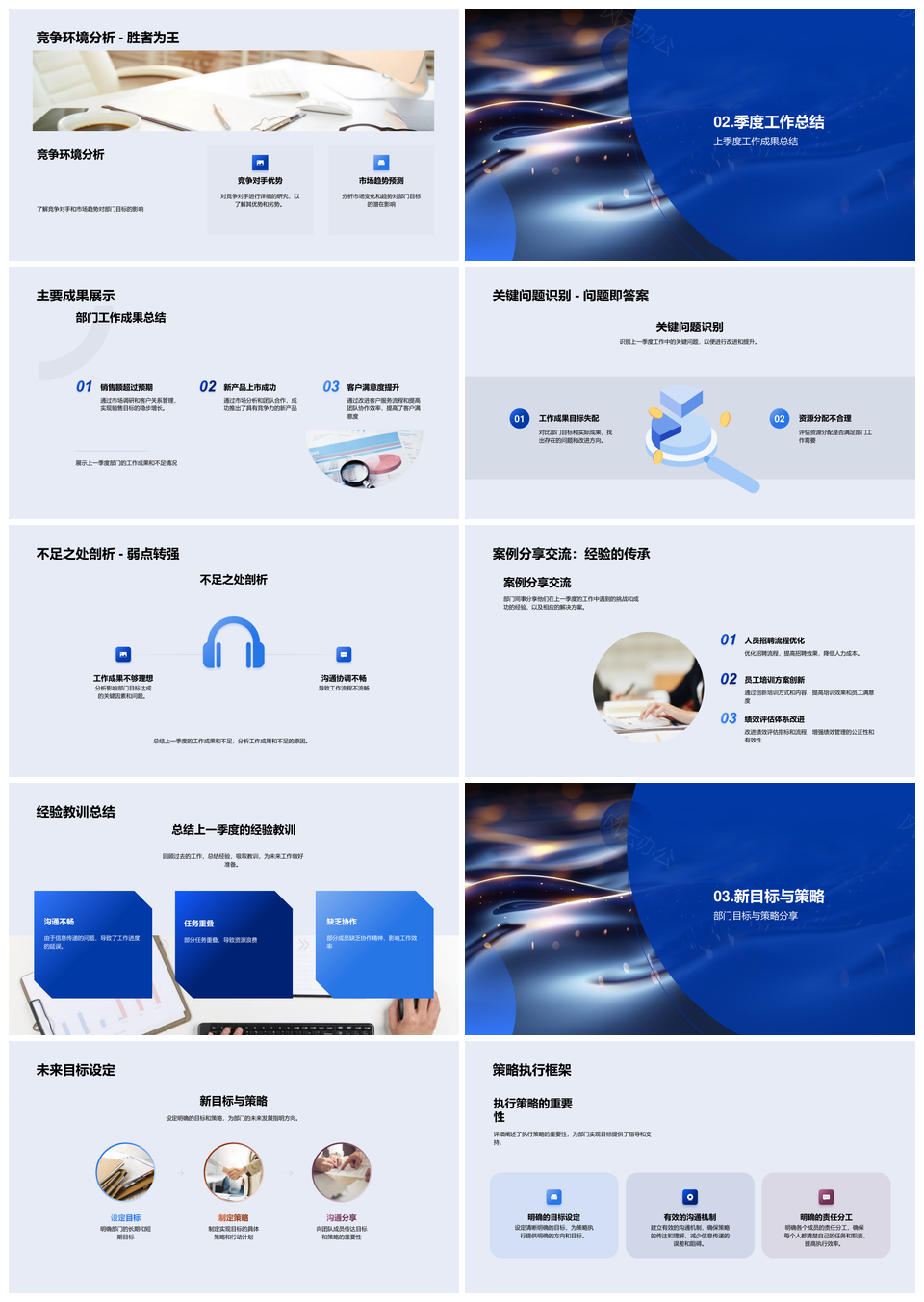 这是一张人资季度目标策略效率团队贡献问题调整竞争创新总结PPT模板,包含人资、季度、目标、策略、效率、团队、贡献、问题、调整、竞争、创新、总结等主题内容,也可用作人资季度目标策略、季度目标策略效率、目标策略效率团队、策略效率团队贡献、效率团队贡献问题、团队贡献问题调整、贡献问题调整竞争、问题调整竞争创新、调整竞争创新总结、人资季度目标、季度目标策略、目标策略效率、策略效率团队、效率团队贡献、团队贡献问题等PPT场景使用。 风云办公提供的人资季度目标策略效率团队贡献问题调整竞争创新总结PPT模板,下载格式为pptx,一共33页,作品中文字及图均可以修改和编辑,图片更改请在作品中右键图片并更换,文字修改请直接点击文字进行修改。