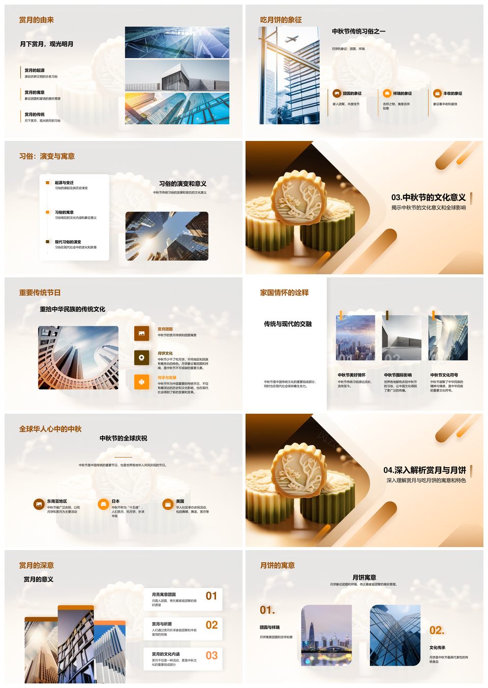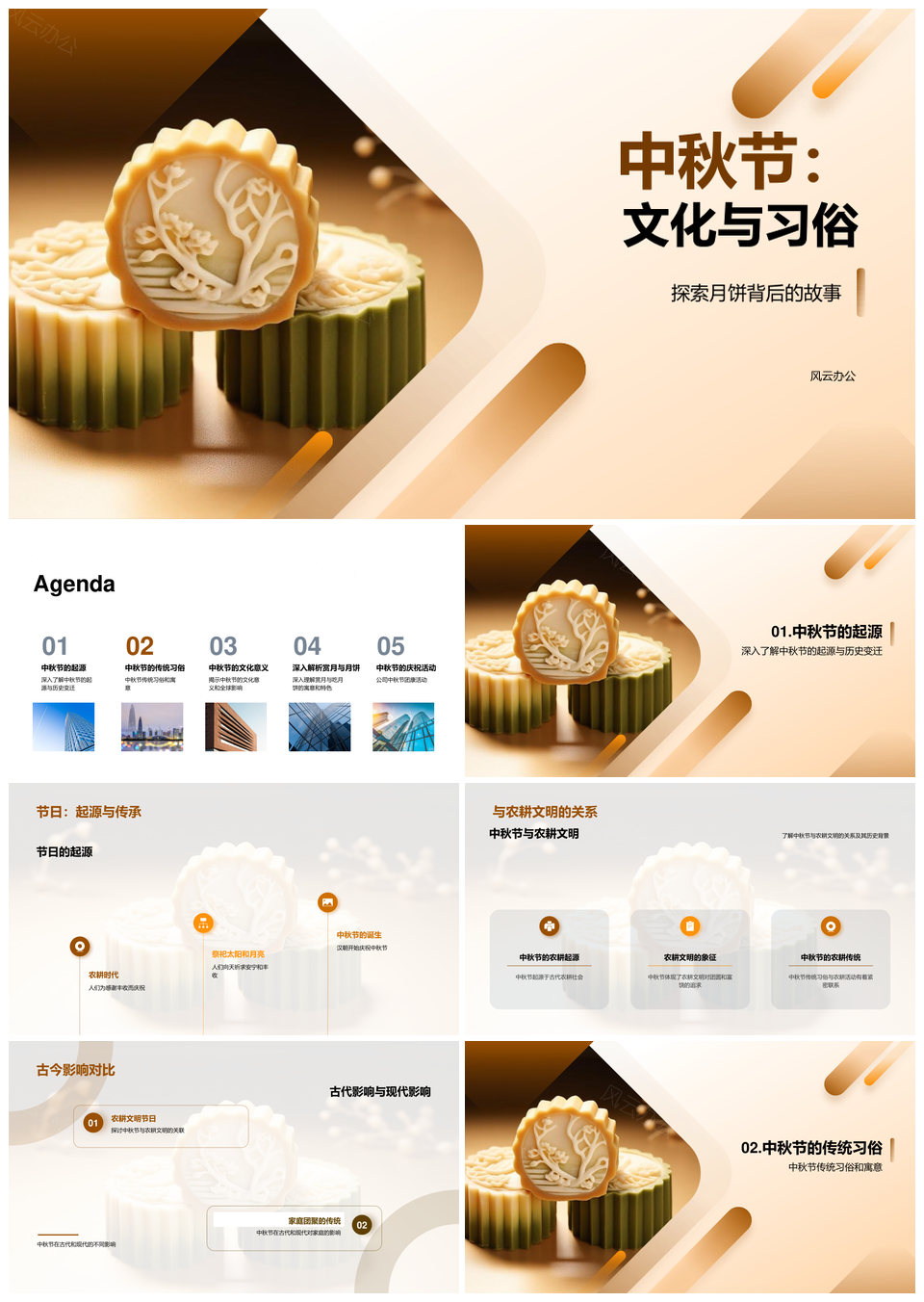 这是一张中秋月饼文化习俗团圆农耕文明富饶祥瑞PPT模板,包含中秋、月饼、文化、习俗、团圆、农耕、文明、富饶、祥瑞等主题内容,也可用作中秋月饼文化习俗、中秋文化习俗团圆、月饼习俗团圆农耕、习俗团圆农耕文明、团圆农耕文明富饶、农耕文明富饶祥瑞、中秋月饼习俗、文化习俗团圆、团圆农耕文明、习俗农耕祥瑞、中秋农耕富饶、月饼文明祥瑞、中秋月饼、文化习俗、农耕文明等PPT场景使用。 风云办公提供的中秋月饼文化习俗团圆农耕文明富饶祥瑞PPT模板,下载格式为pptx,一共23页,作品中文字及图均可以修改和编辑,图片更改请在作品中右键图片并更换,文字修改请直接点击文字进行修改。