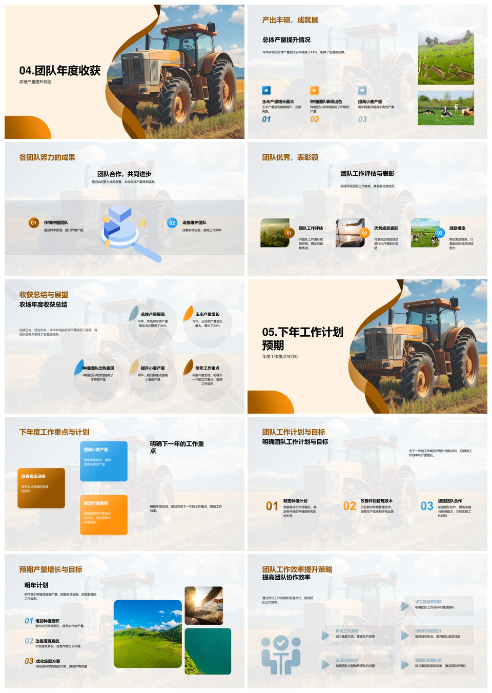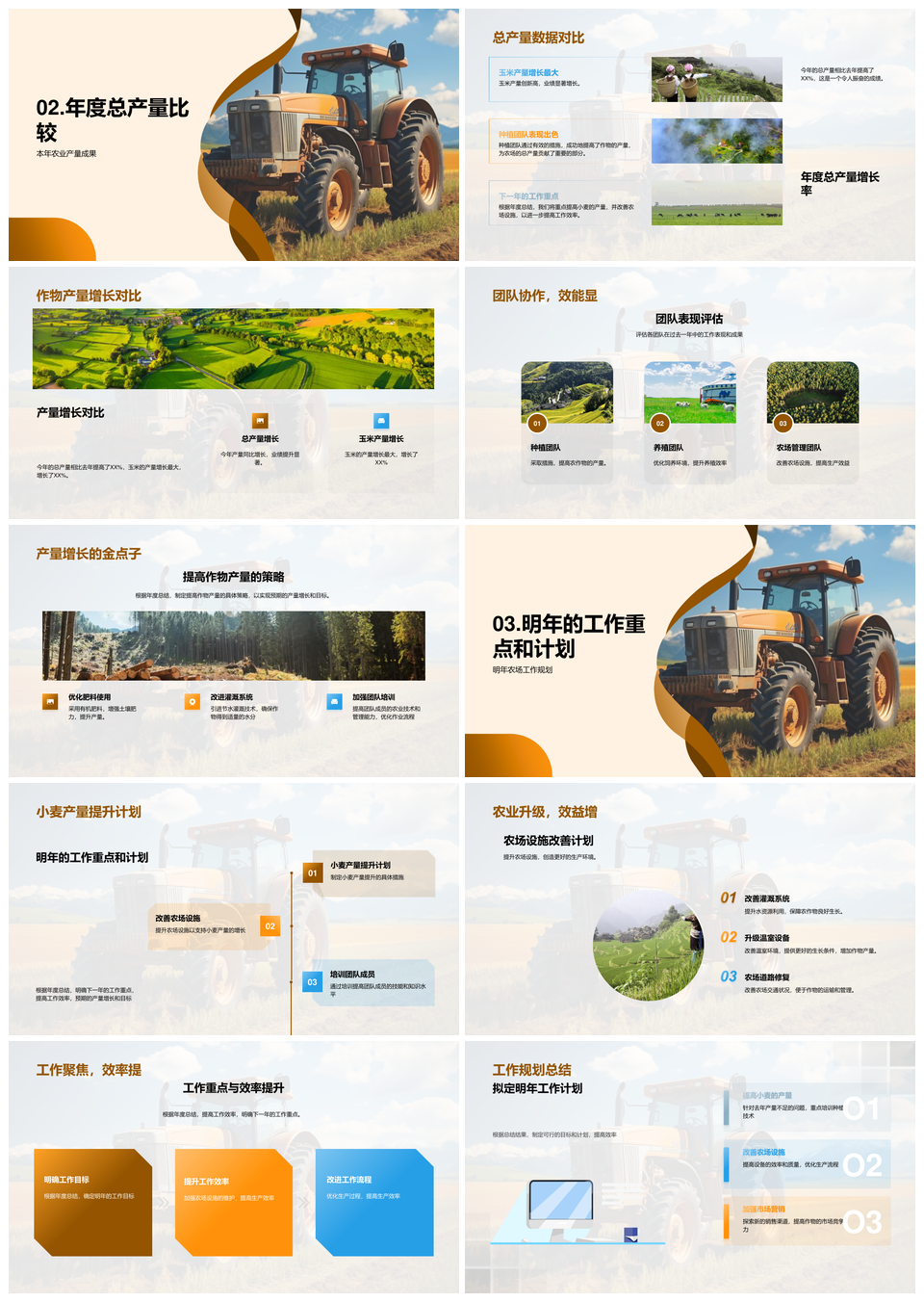 这是一张农场生产年度产量对比与下年计划设施改善总结PPT模板,包含农场、生产、年度、产量、对比、下年、计划、设施、改善、总结等主题内容,也可用作农场生产年度产量对比下年计划设施改善总结、农场生产年度产量对比下年计划、年度产量对比下年计划设施改善、对比下年计划设施改善总结、农场生产年度产量对比、年度产量对比下年计划、对比下年计划设施改善、下年计划设施改善总结、农场生产年度产量、年度产量对比、对比下年计划、下年计划设施改善、设施改善总结、农场生产设施改善、农场生产下年计划等PPT场景使用。 风云办公提供的农场生产年度产量对比与下年计划设施改善总结PPT模板,下载格式为pptx,一共28页,作品中文字及图均可以修改和编辑,图片更改请在作品中右键图片并更换,文字修改请直接点击文字进行修改。