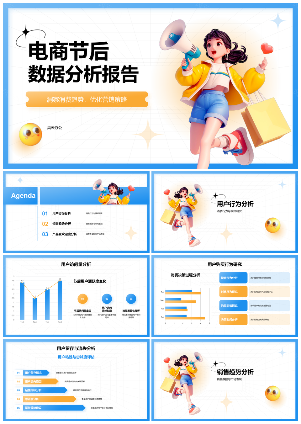 风云办公提供的电商节网购用户行为销售趋势数据分析PPT模板,下载格式为pptx,一共15页,作品中文字及图均可以修改和编辑,图片更改请在作品中右键图片并更换,文字修改请直接点击文字进行修改。