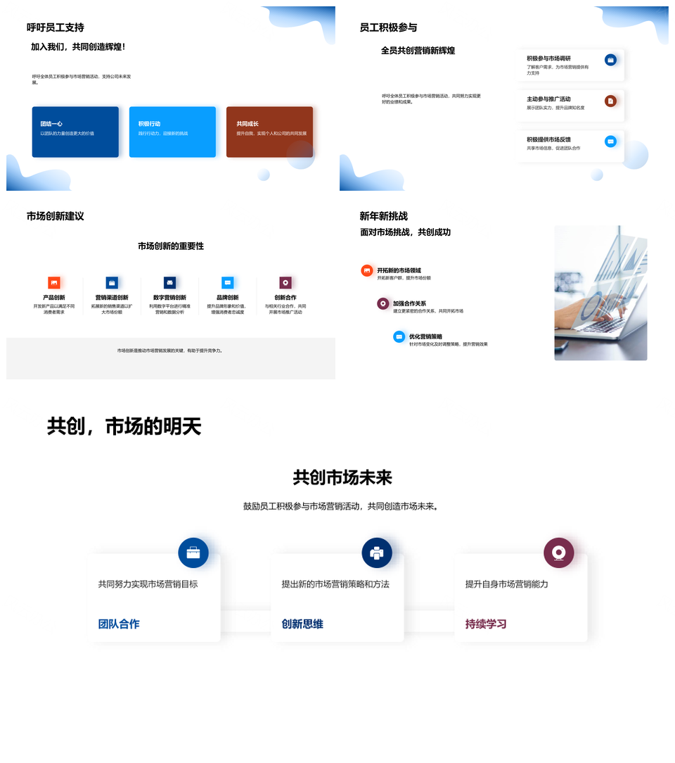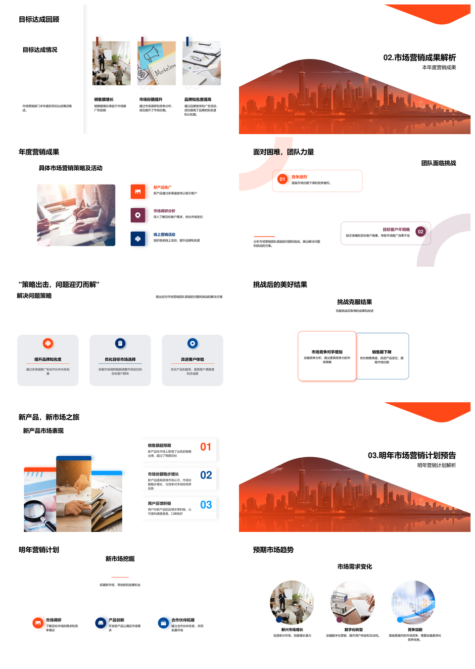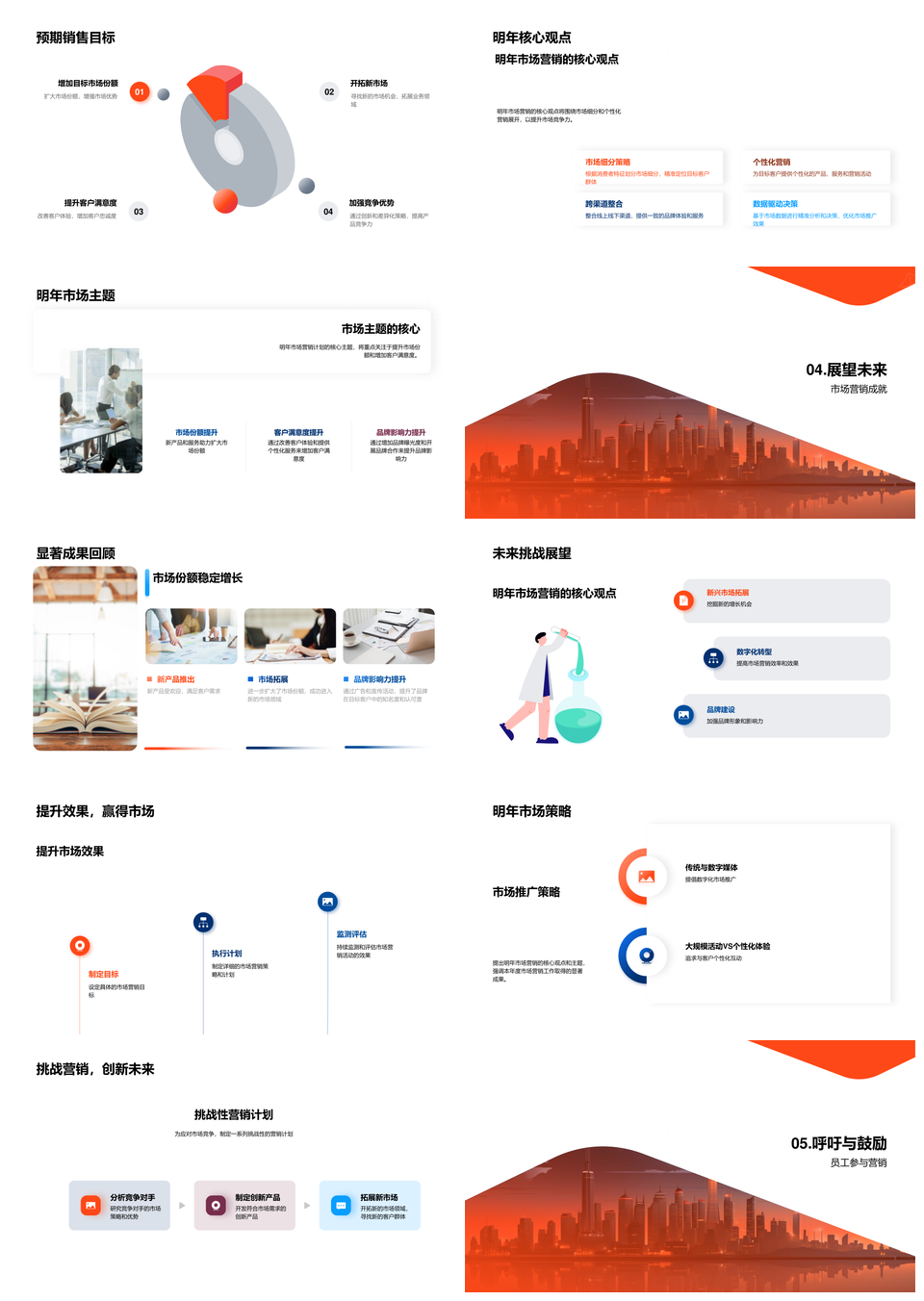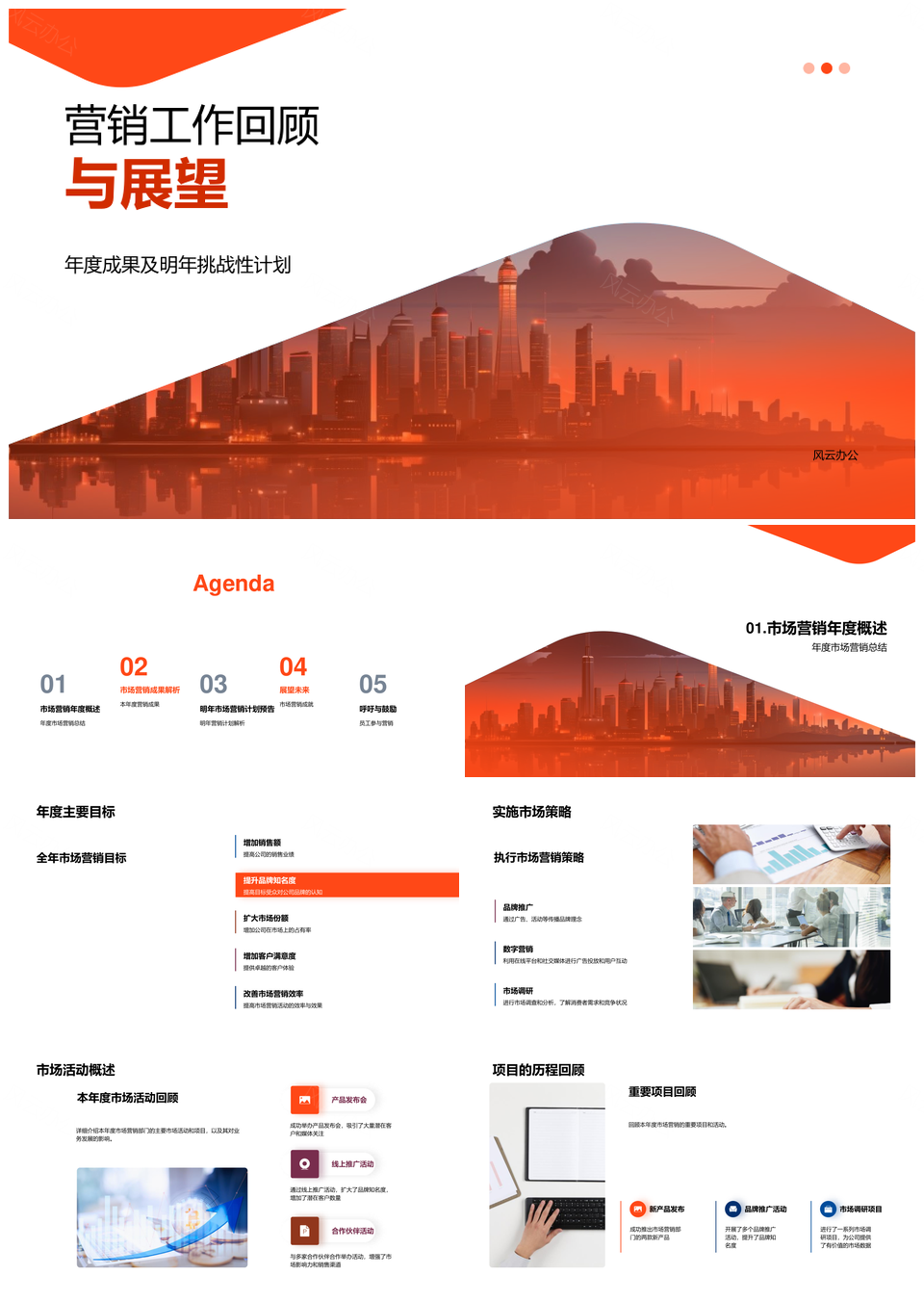 这是一张市场营销工作回顾展望策略成果团队计划PPT模板,包含市场营销、工作、回顾、展望、策略、成果、团队、计划等主题内容,也可用作市场营销工作回顾展望、工作回顾展望策略、回顾展望策略成果、策略成果团队计划、市场营销工作策略、工作策略成果、回顾展望策略、展望策略成果、市场营销策略成果、策略成果团队、成果团队计划、市场营销团队计划、市场营销工作、工作回顾、回顾展望等PPT场景使用。 风云办公提供的市场营销工作回顾展望策略成果团队计划PPT模板,下载格式为pptx,一共33页,作品中文字及图均可以修改和编辑,图片更改请在作品中右键图片并更换,文字修改请直接点击文字进行修改。