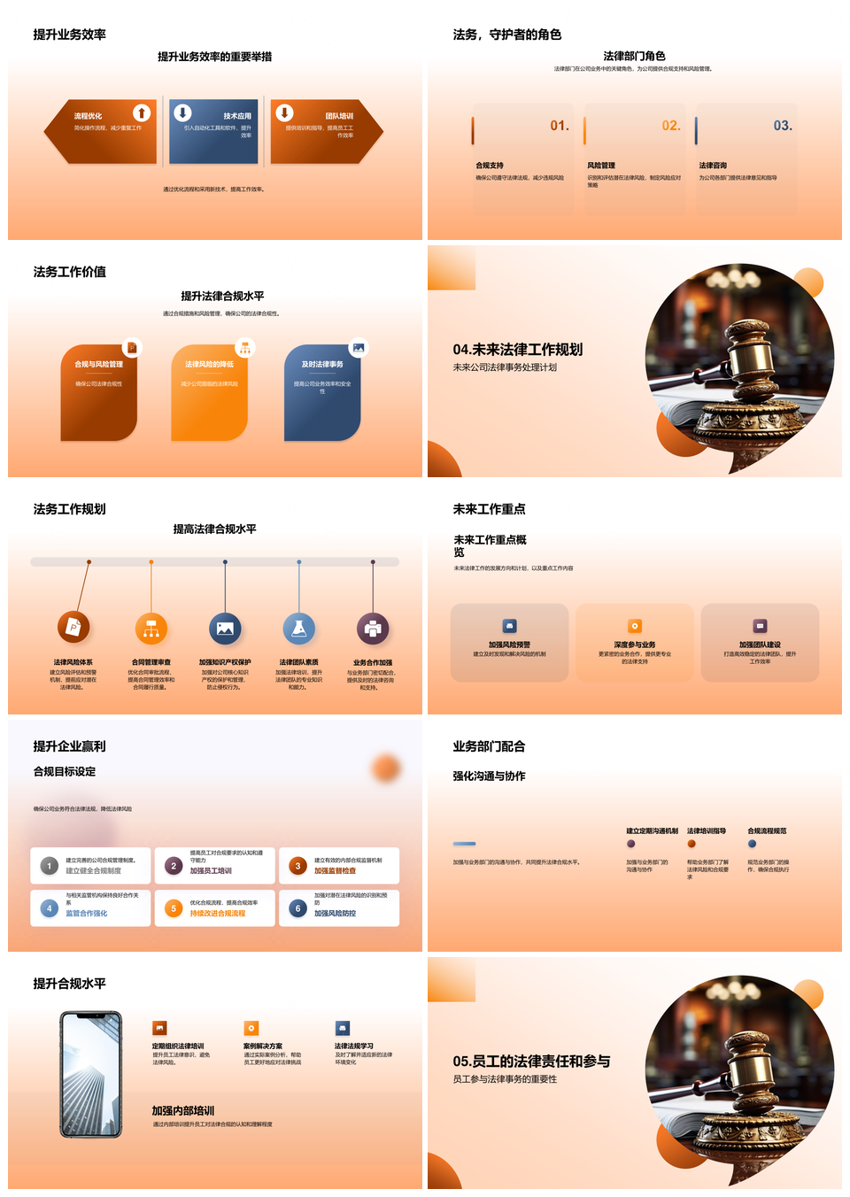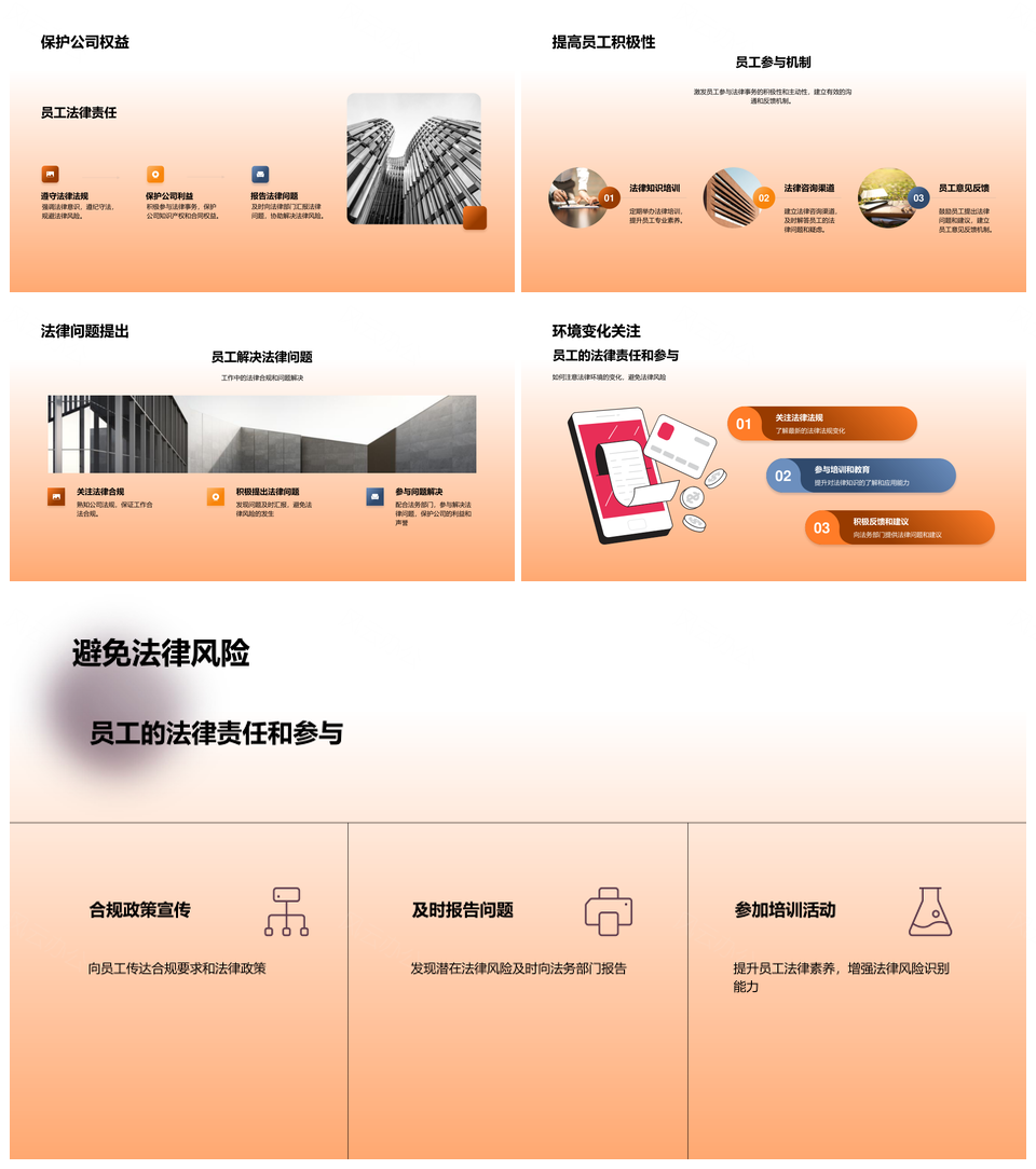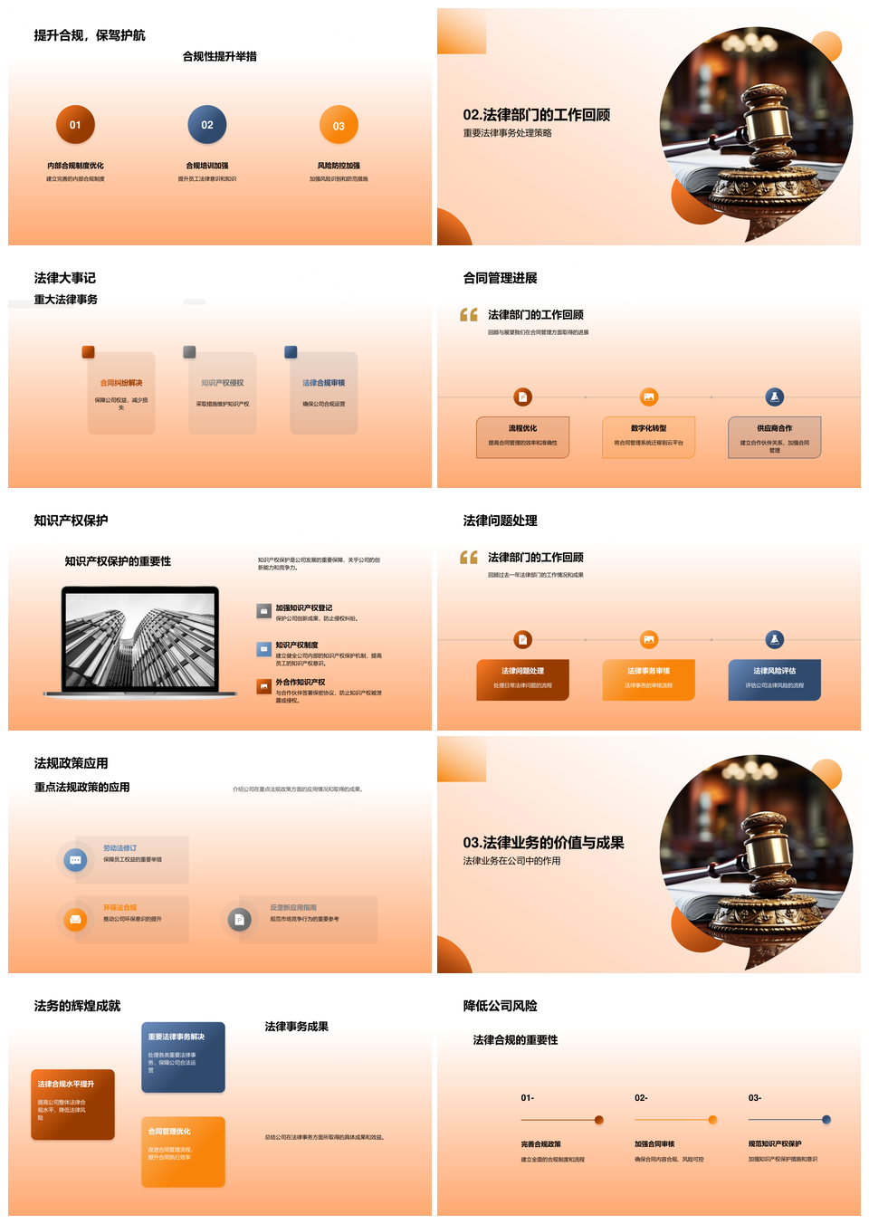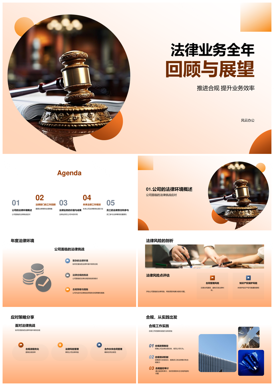 这是一张法律合规效率知产合同风险年度回顾展望PPT模板,包含法律、合规、效率、知产、合同、风险、年度、回顾、展望等主题内容,也可用作法律合规效率知产、合规效率知产合同、效率知产合同风险、合同风险年度回顾、风险年度回顾展望、法律合规合同风险、合规效率合同年度、知产合同年度回顾、合同风险展望效率、法律风险知产年度、合规合同回顾展望、效率风险年度展望、法律合规年度展望、合规效率知产风险、合同年度回顾展望等PPT场景使用。 风云办公提供的法律合规效率知产合同风险年度回顾展望PPT模板,下载格式为pptx,一共33页,作品中文字及图均可以修改和编辑,图片更改请在作品中右键图片并更换,文字修改请直接点击文字进行修改。