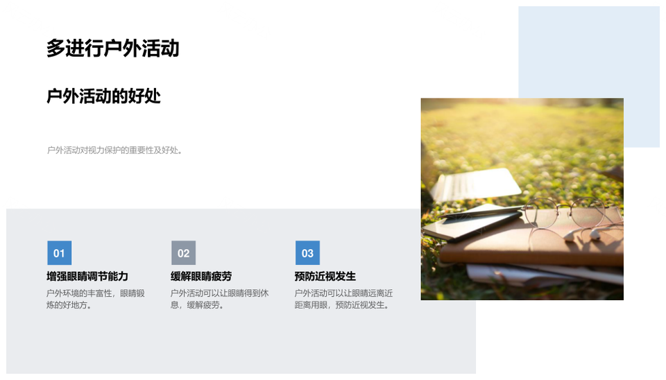 这是一张防控近视护眼端正姿势远离屏幕多户外合理休息PPT模板,包含防控、近视、护眼、端正、姿势、屏幕、户外、合理、休息等主题内容,也可用作防控近视护眼户外、护眼端正姿势远离、远离屏幕合理休息、防控近视护眼端正、护眼端正姿势屏幕、防控近视合理休息、防控近视护眼合理、护眼姿势远离屏幕、端正姿势远离屏幕、防控近视护眼姿势、远离屏幕户外休息、护眼远离屏幕户外、户外合理休息防控、合理休息防控近视、防控近视远离屏幕等PPT场景使用。 风云办公提供的防控近视护眼端正姿势远离屏幕多户外合理休息PPT模板,下载格式为pptx,一共29页,作品中文字及图均可以修改和编辑,图片更改请在作品中右键图片并更换,文字修改请直接点击文字进行修改。