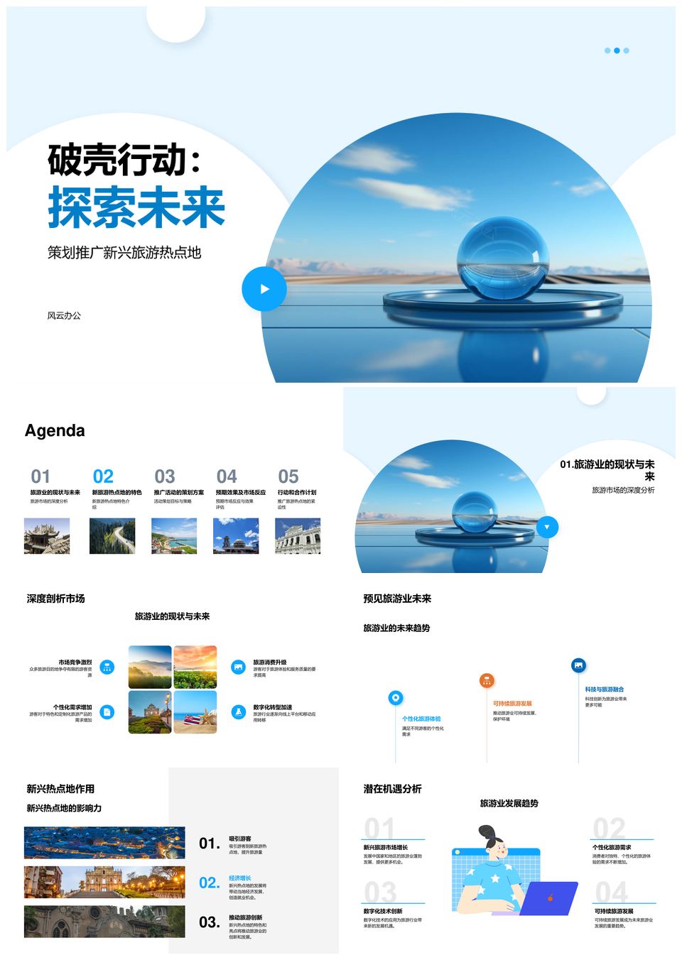 风云办公提供的破壳行动新兴旅游热点市场趋势分析PPT模板,下载格式为pptx,一共29页,作品中文字及图均可以修改和编辑,图片更改请在作品中右键图片并更换,文字修改请直接点击文字进行修改。