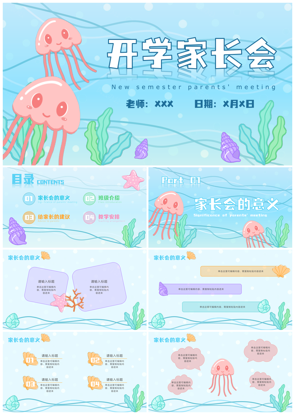 这是一张开学家长会第一课蓝海粉水母教育PPT模板,包含开学、家长会、第一课、蓝海粉水母教育等主题内容,也可用作开学家长会第一课教育、家长会第一课蓝海教育、开学蓝海粉水母教育、开学家长会第一课蓝海、家长会第一课蓝海粉水母、第一课蓝海粉水母教育、蓝海粉水母教育、开学家长会第一课、家长会第一课蓝海、第一课蓝海教育、开学蓝海粉水母、家长会蓝海教育、开学家长会、家长会第一课、蓝海粉水母等PPT场景使用。