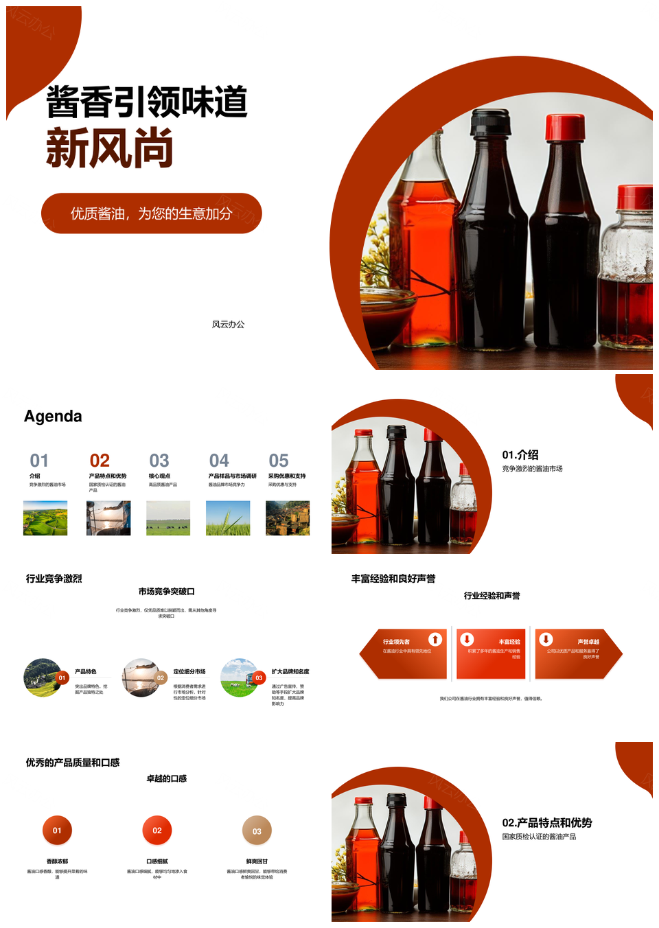风云办公提供的酱油品牌农产新品营销采购对接PPT模板,下载格式为pptx,一共23页,作品中文字及图均可以修改和编辑,图片更改请在作品中右键图片并更换,文字修改请直接点击文字进行修改。