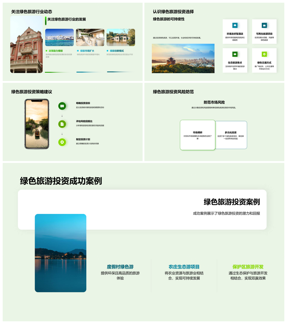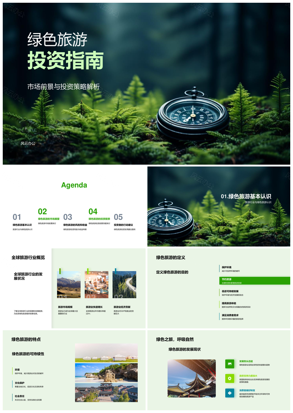 这是一张绿色旅游投资策略与市场前景PPT模板,包含绿色旅游、投资策略、市场前景等主题内容,也可用作绿色旅游投资策略、绿色旅游市场前景、绿色旅游投资前景、绿色旅游投资、旅游投资策略、绿色旅游市场、旅游市场前景、绿色投资策略、绿色市场前景、绿色旅游、旅游投资、投资策略、市场前景、绿色市场、旅游市场等PPT场景使用。 风云办公提供的绿色旅游投资策略与市场前景PPT模板,下载格式为pptx,一共33页,作品中文字及图均可以修改和编辑,图片更改请在作品中右键图片并更换,文字修改请直接点击文字进行修改。