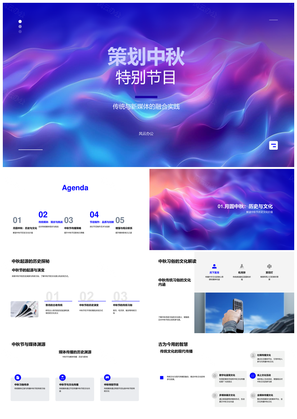 风云办公提供的中秋融媒节目数字转型文化互动PPT模板,下载格式为pptx,一共33页,作品中文字及图均可以修改和编辑,图片更改请在作品中右键图片并更换,文字修改请直接点击文字进行修改。
