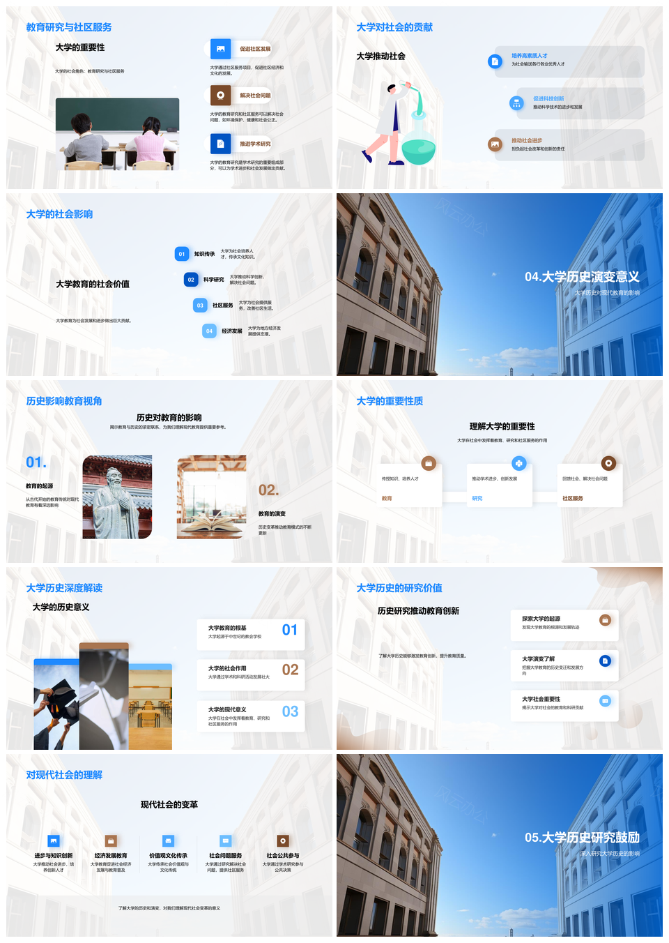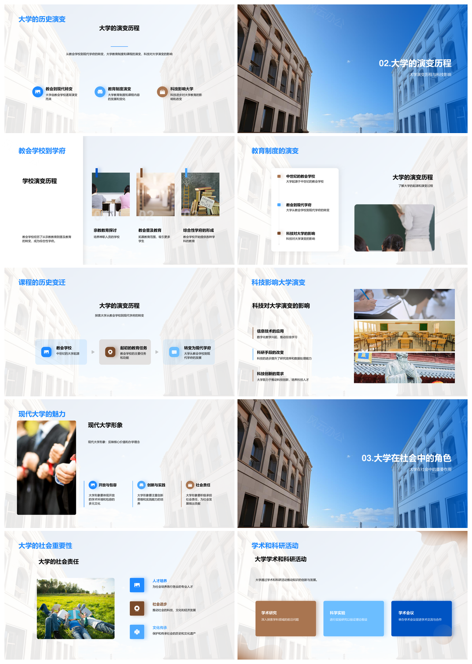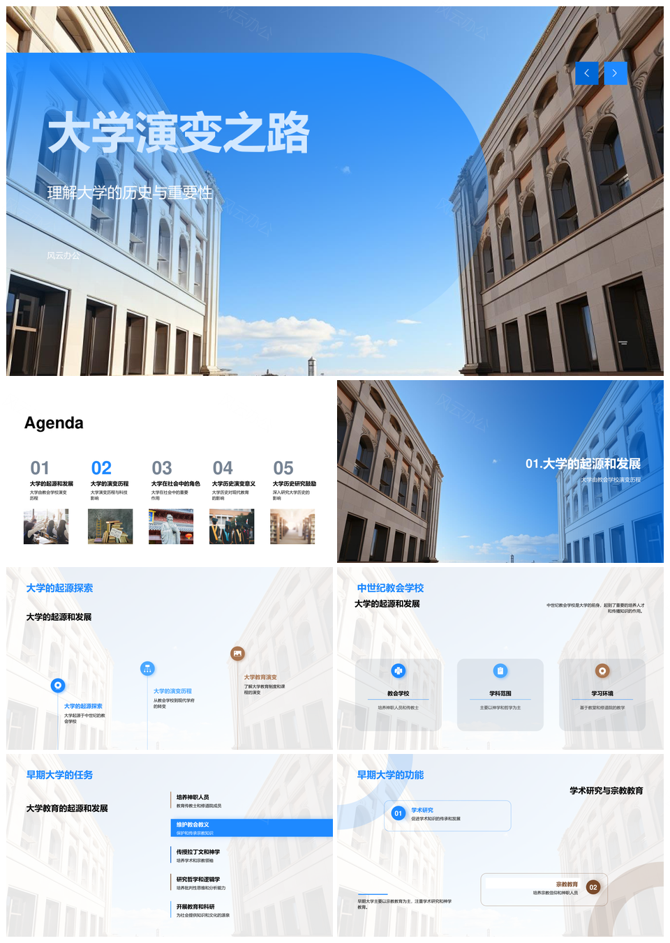 风云办公提供的大学教育历史演变教会学校科技影响PPT模板,下载格式为pptx,一共33页,作品中文字及图均可以修改和编辑,图片更改请在作品中右键图片并更换,文字修改请直接点击文字进行修改。