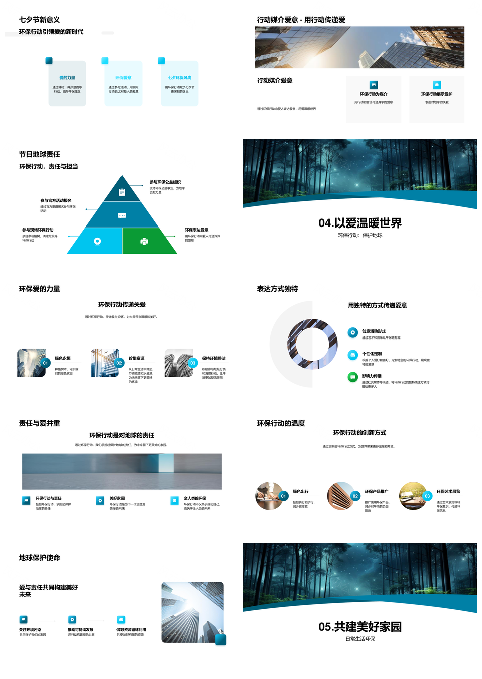 风云办公提供的七夕公益环保爱行动护竹林PPT模板,下载格式为pptx,一共33页,作品中文字及图均可以修改和编辑,图片更改请在作品中右键图片并更换,文字修改请直接点击文字进行修改。