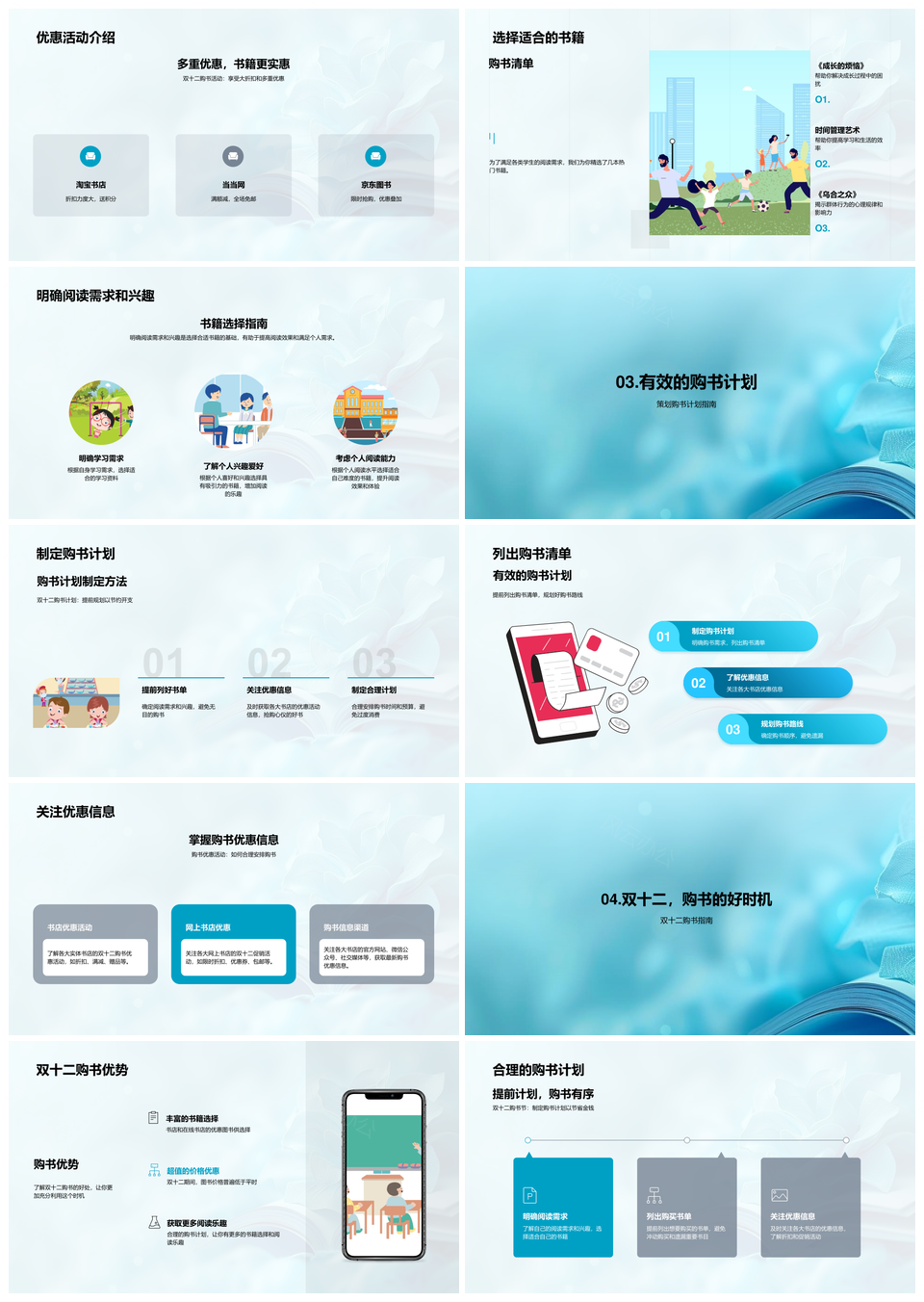 风云办公提供的双十二购书攻略优惠书单规划计划PPT模板,下载格式为pptx,一共23页,作品中文字及图均可以修改和编辑,图片更改请在作品中右键图片并更换,文字修改请直接点击文字进行修改。