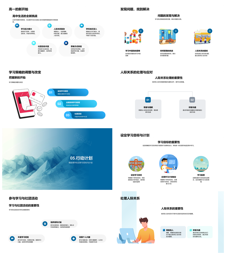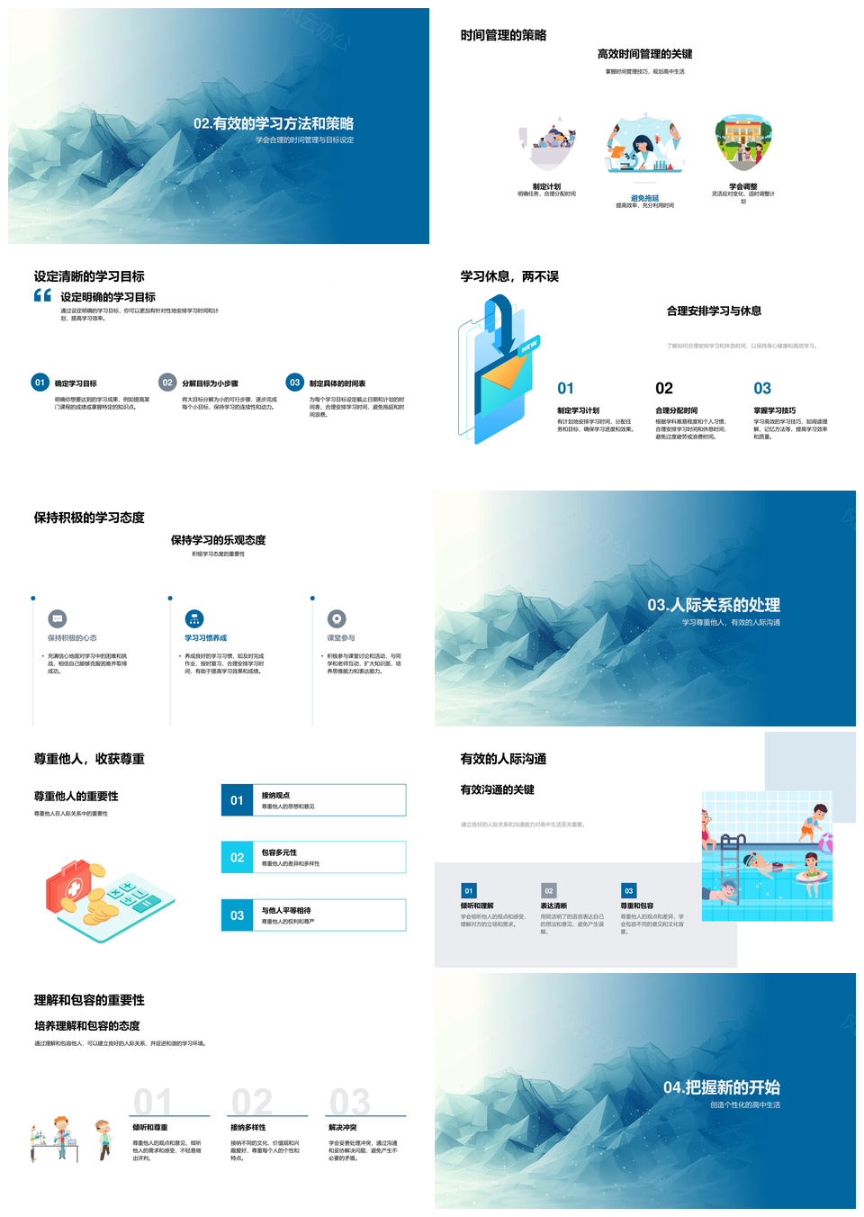风云办公提供的高一新生学习人际时间管理策略PPT模板,下载格式为pptx,一共26页,作品中文字及图均可以修改和编辑,图片更改请在作品中右键图片并更换,文字修改请直接点击文字进行修改。