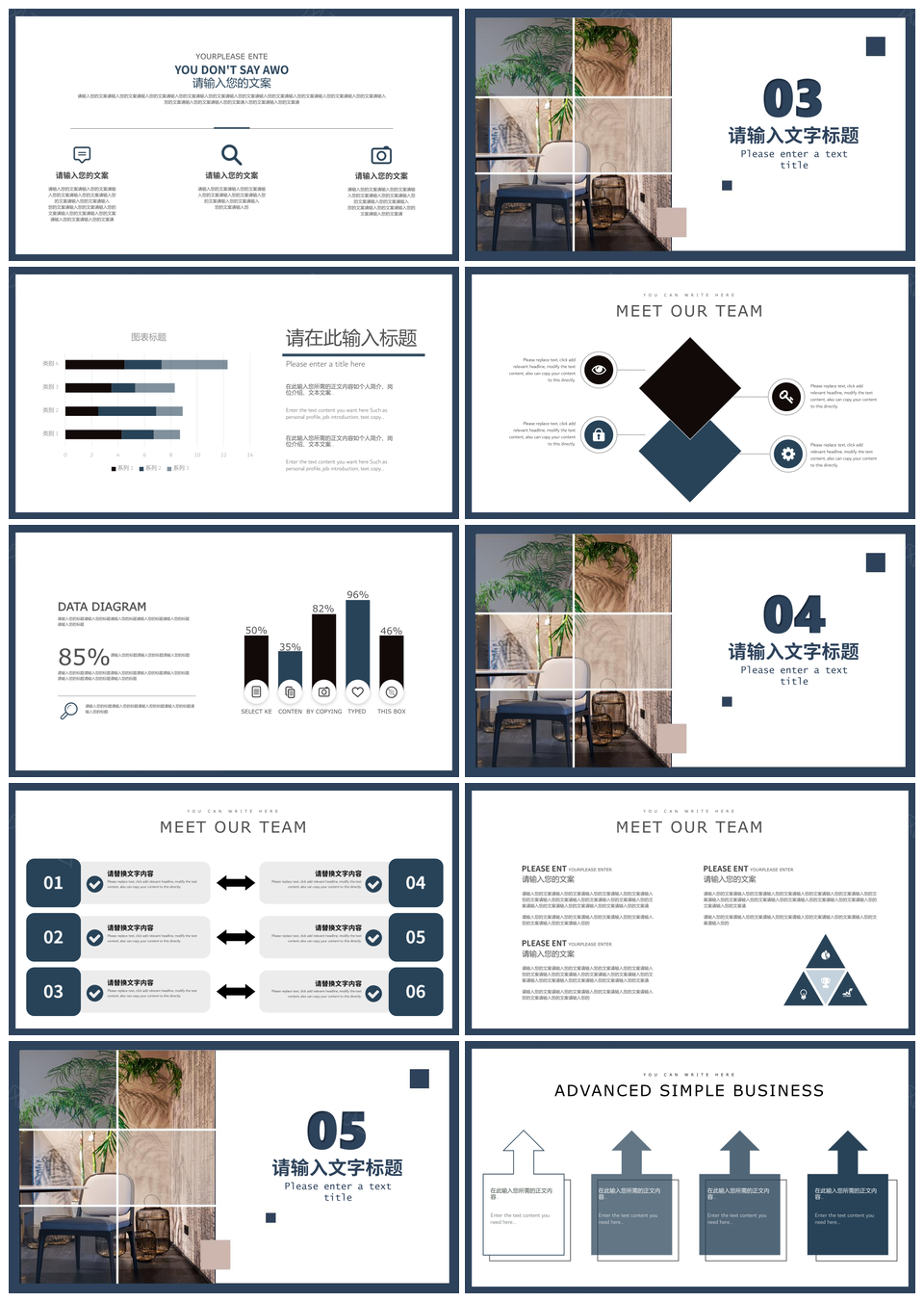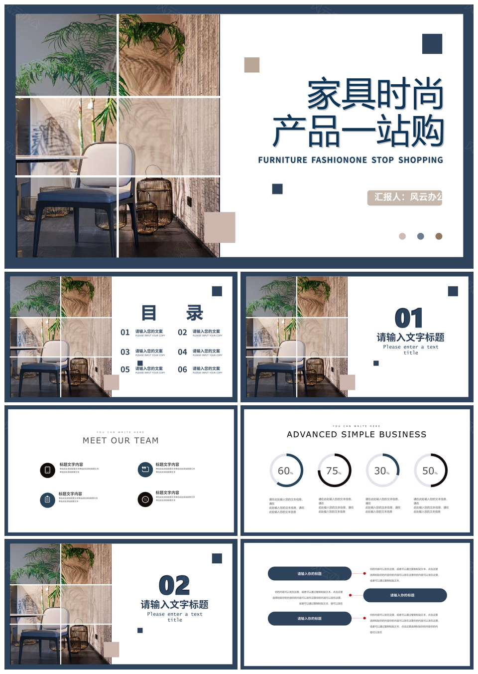 风云办公提供的蓝色画册风家居家具时尚产品销售推荐PPT模板,下载格式为pptx,一共25页,作品中文字及图均可以修改和编辑,图片更改请在作品中右键图片并更换,文字修改请直接点击文字进行修改。