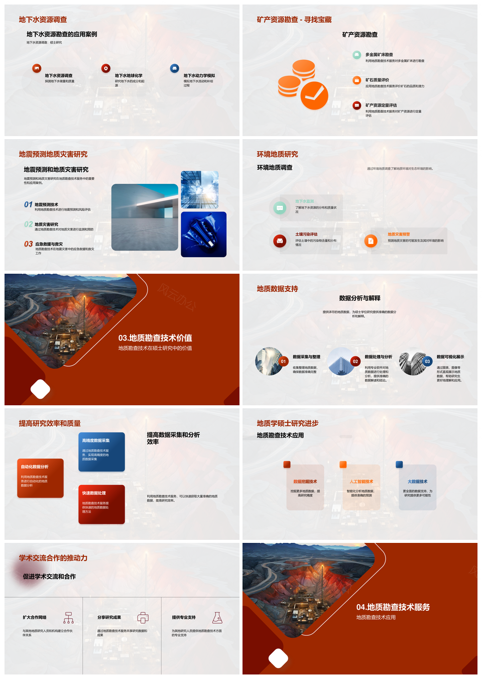 风云办公提供的地质勘查科技创新发展与资源勘查应用PPT模板,下载格式为pptx,一共21页,作品中文字及图均可以修改和编辑,图片更改请在作品中右键图片并更换,文字修改请直接点击文字进行修改。