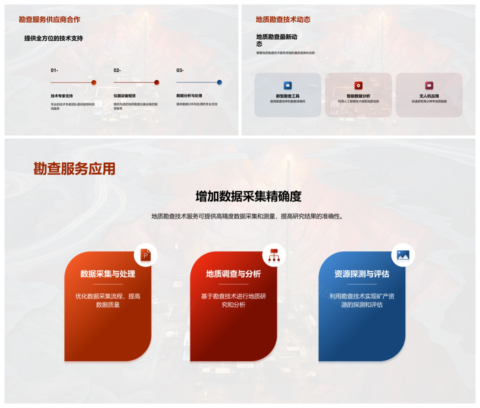 这是一张地质勘查科技创新发展与资源勘查应用PPT模板,包含地质勘查、科技创新、发展、资源勘查、应用等主题内容,也可用作地质勘查科技创新发展、科技创新发展资源勘查、发展资源勘查应用、地质勘查科技创新、科技创新发展应用、资源勘查应用发展、地质勘查资源勘查、地质勘查科技应用、勘查科技创新发展、发展资源勘查、科技创新应用、资源勘查发展、勘查科技应用、地质勘查发展、发展应用等PPT场景使用。