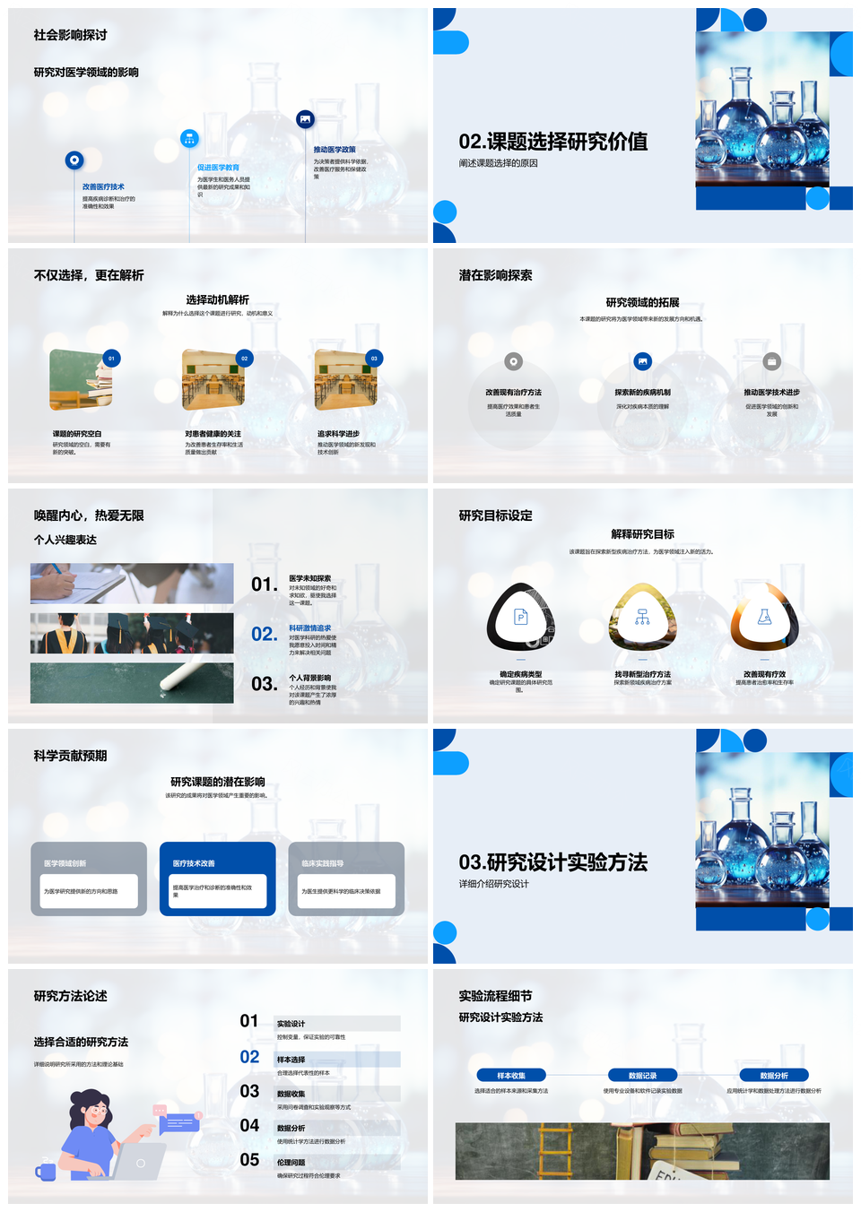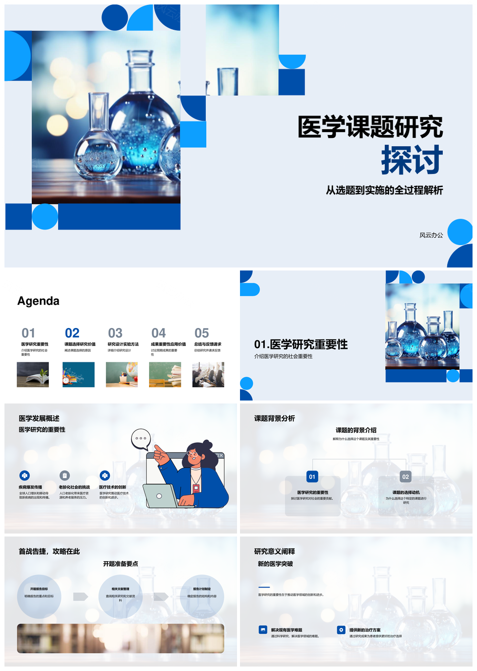 风云办公提供的医学课题选题实施研究设计实验方法PPT模板,下载格式为pptx,一共33页,作品中文字及图均可以修改和编辑,图片更改请在作品中右键图片并更换,文字修改请直接点击文字进行修改。