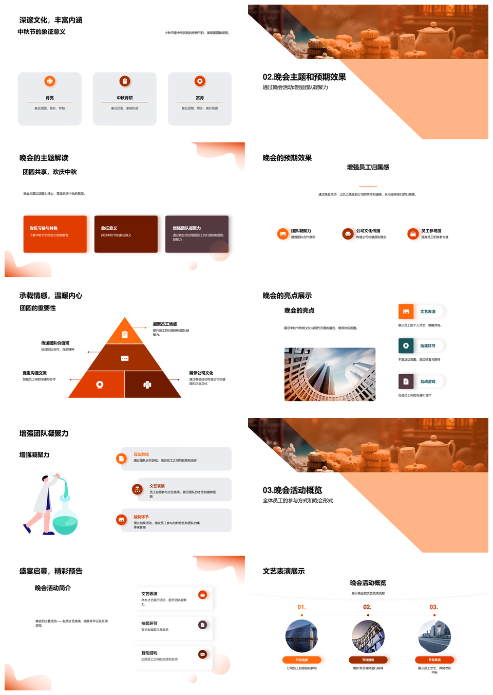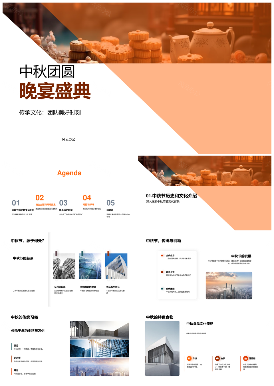 风云办公提供的中秋团圆晚宴传承文化月饼主题晚会PPT模板,下载格式为pptx,一共33页,作品中文字及图均可以修改和编辑,图片更改请在作品中右键图片并更换,文字修改请直接点击文字进行修改。