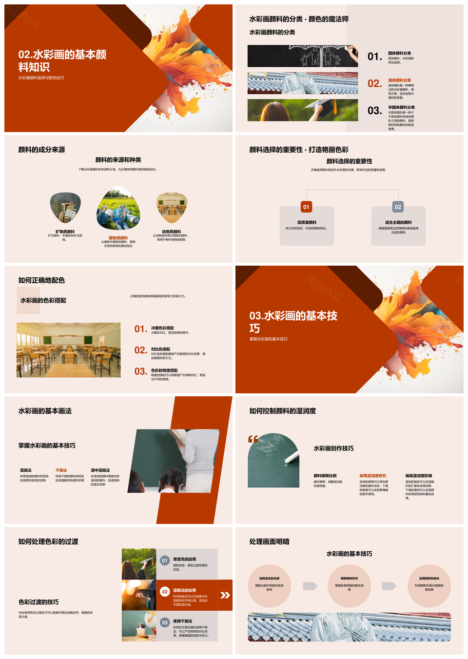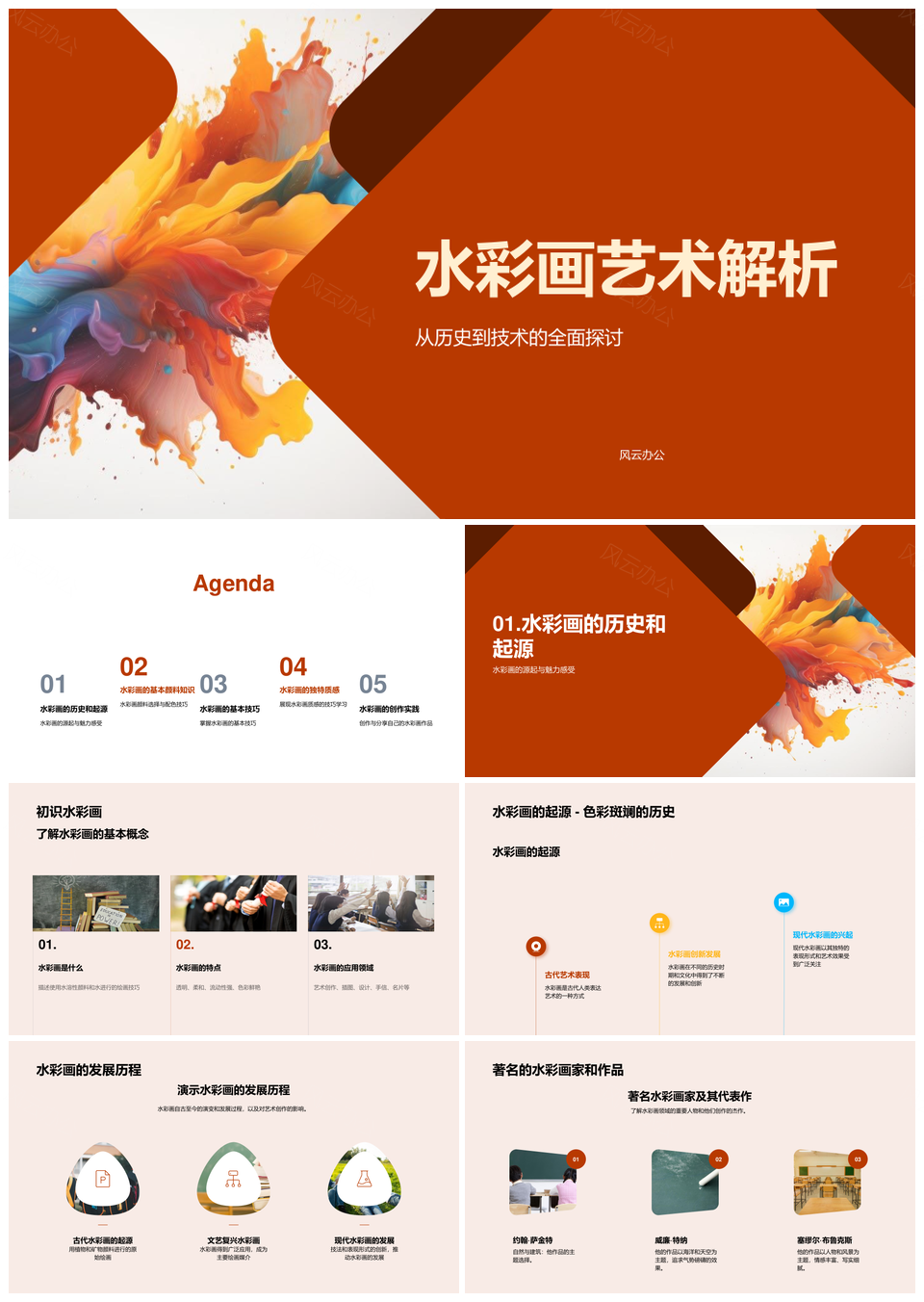 这是一张水彩画颜料画法配色湿润度明暗关系解析PPT模板,包含水彩画、颜料、画法、配色、湿润度、明暗关系、解析等主题内容,也可用作水彩画颜料画法配色、颜料画法配色湿润度、画法配色湿润度明暗关系、配色湿润度明暗关系解析、水彩画颜料画法、颜料画法配色、画法配色湿润度、配色湿润度明暗关系、湿润度明暗关系解析、水彩画颜料、颜料画法、画法配色、配色湿润度、湿润度明暗关系、明暗关系解析等PPT场景使用。 风云办公提供的水彩画颜料画法配色湿润度明暗关系解析PPT模板,下载格式为pptx,一共27页,作品中文字及图均可以修改和编辑,图片更改请在作品中右键图片并更换,文字修改请直接点击文字进行修改。