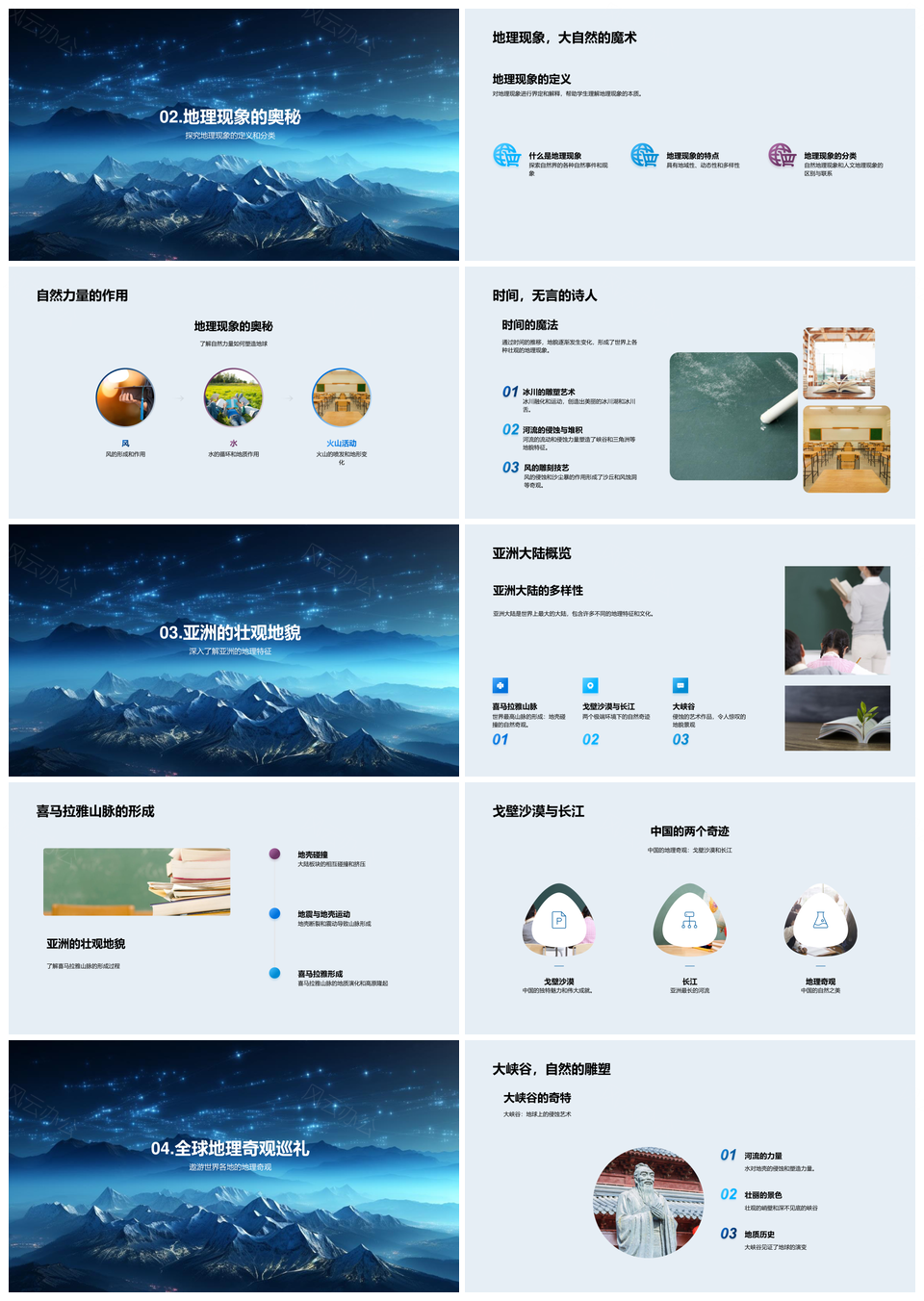 这是一张地理之旅探地球奇观板块构造自然力量亚洲地貌PPT模板,包含地理之旅、探地球、奇观、板块、构造、自然力量、亚洲、地貌等主题内容,也可用作地理之旅地球奇观、地球奇观板块构造、板块构造自然力量、自然力量亚洲地貌、亚洲地貌地理之旅、地理之旅板块构造、地球奇观自然力量、板块构造亚洲地貌、自然力量地理之旅、亚洲地貌地球奇观、地球奇观亚洲地貌、自然力量板块构造、地理之旅自然力量、板块构造地理之旅、自然力量地球奇观等PPT场景使用。 风云办公提供的地理之旅探地球奇观板块构造自然力量亚洲地貌PPT模板,下载格式为pptx,一共24页,作品中文字及图均可以修改和编辑,图片更改请在作品中右键图片并更换,文字修改请直接点击文字进行修改。
