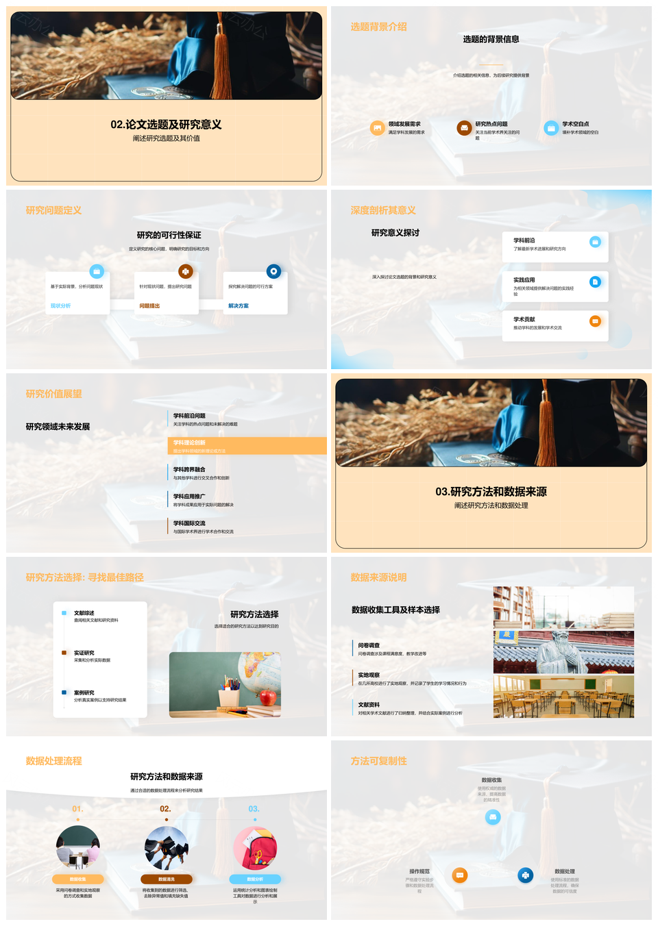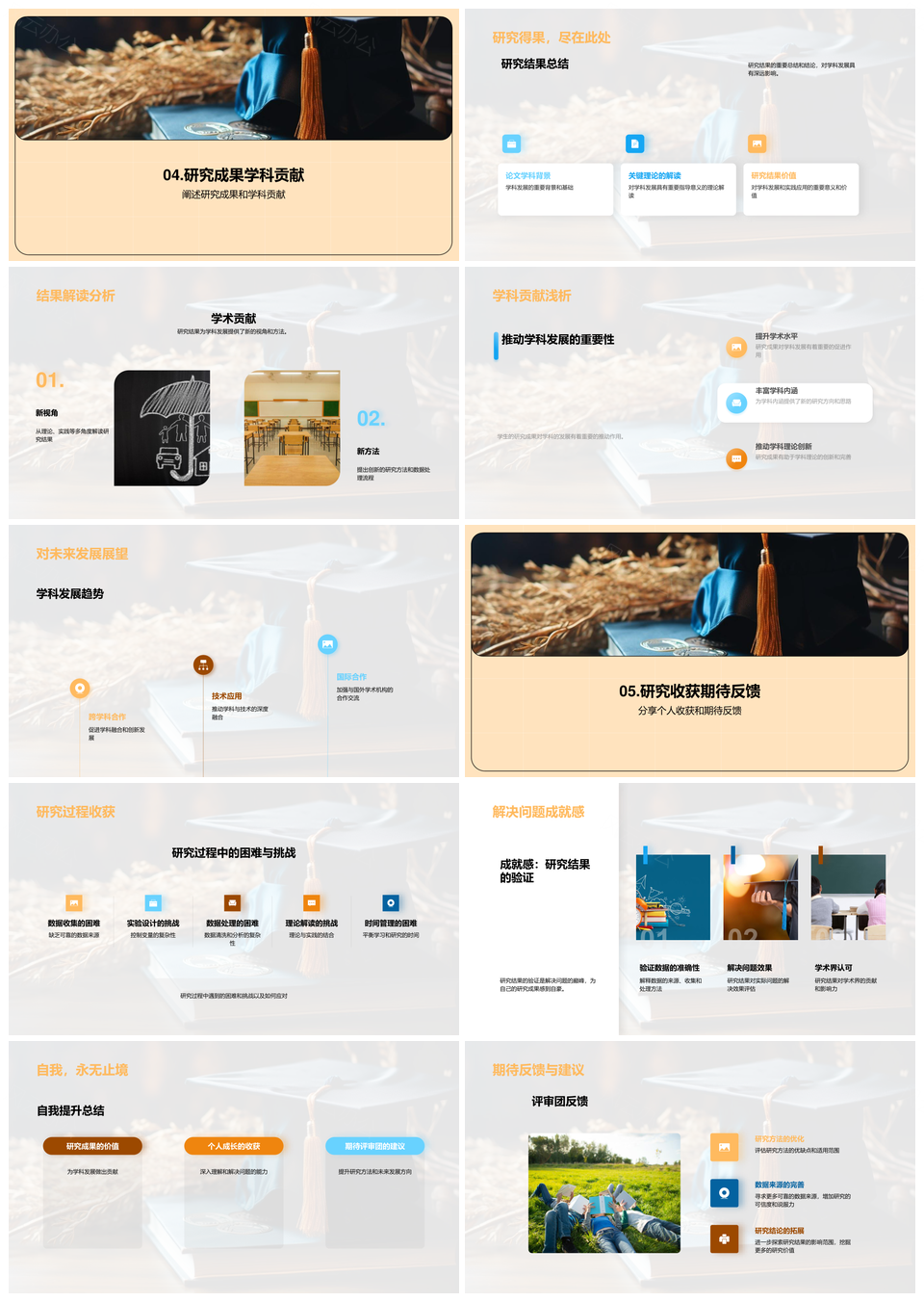 学位论文精准研究学科理论方法数据成果贡献毕业帽PPT模板推荐