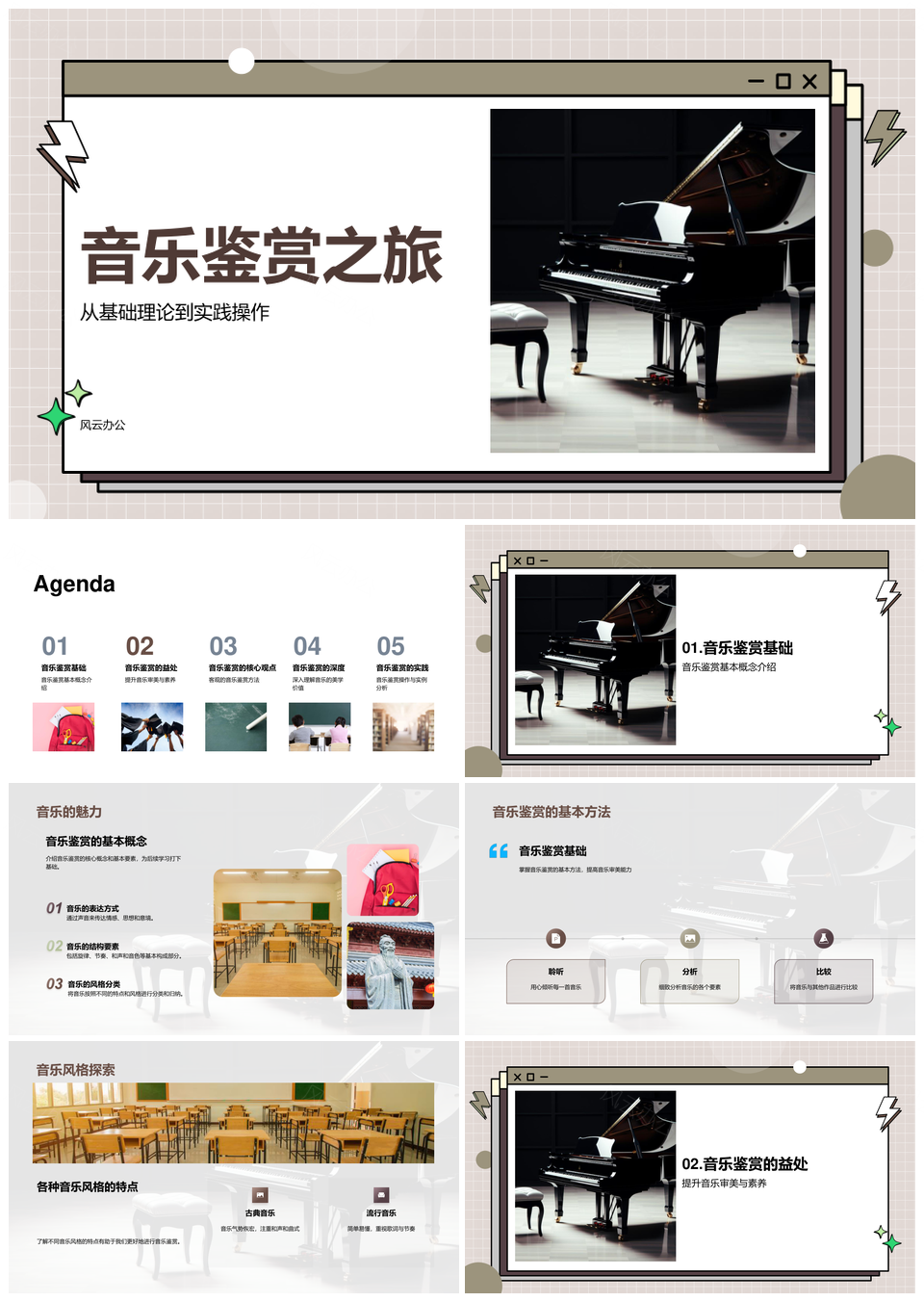 风云办公提供的音乐鉴赏理论与实践硕士生审美素养PPT模板,下载格式为pptx,一共23页,作品中文字及图均可以修改和编辑,图片更改请在作品中右键图片并更换,文字修改请直接点击文字进行修改。