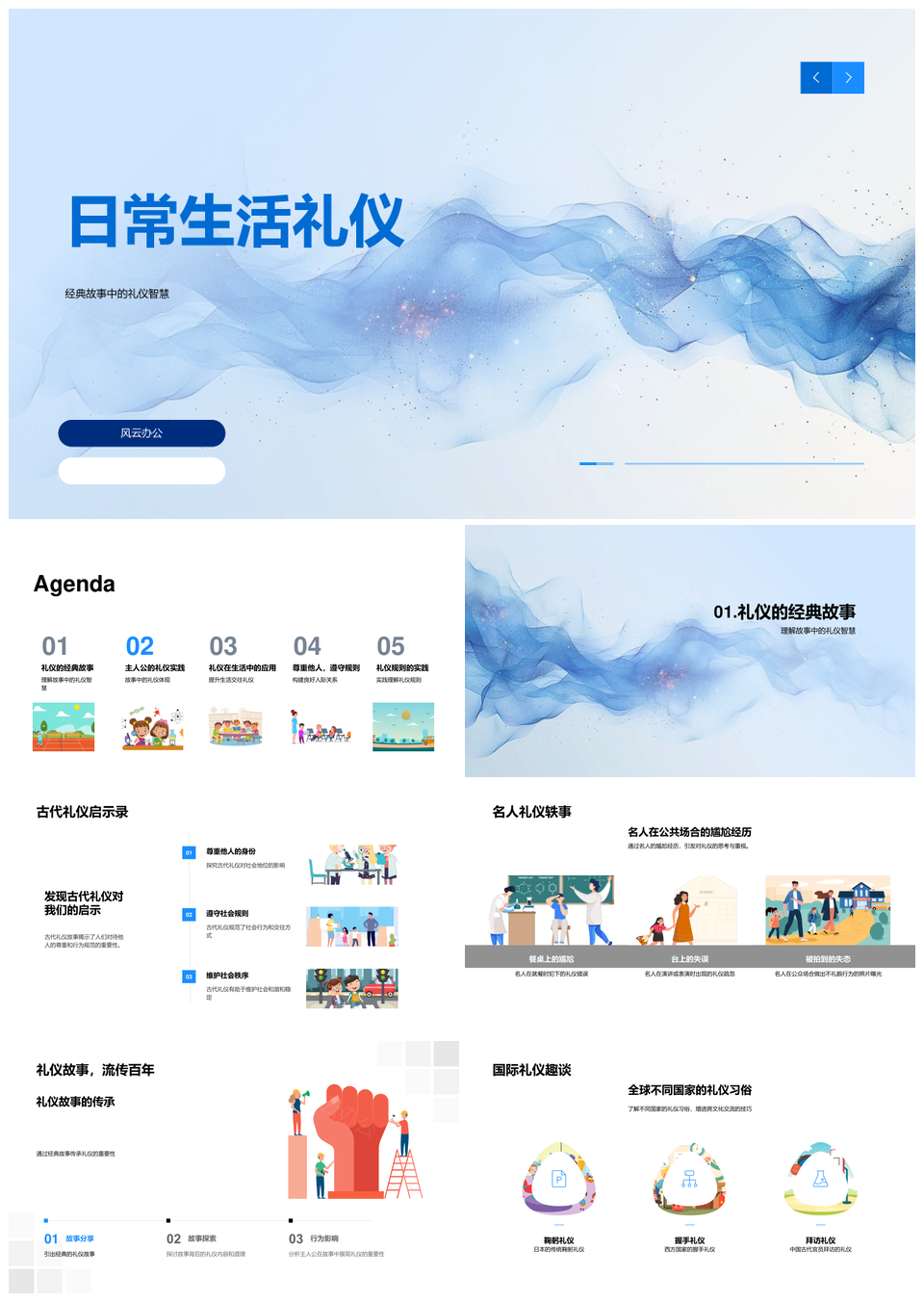 风云办公提供的礼仪智慧经典故事中的尊人守则实践PPT模板,下载格式为pptx,一共33页,作品中文字及图均可以修改和编辑,图片更改请在作品中右键图片并更换,文字修改请直接点击文字进行修改。
