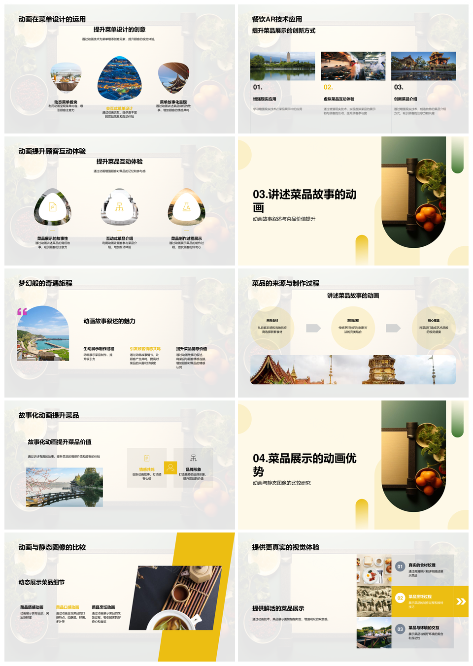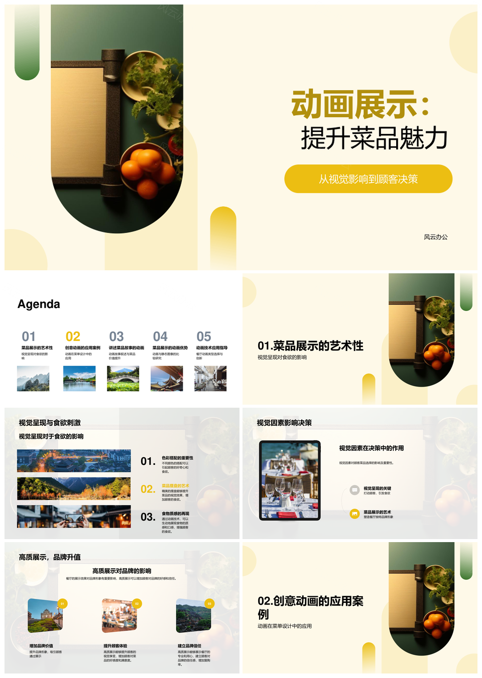风云办公提供的动画菜品视觉魅力提升顾客餐饮决策PPT模板,下载格式为pptx,一共23页,作品中文字及图均可以修改和编辑,图片更改请在作品中右键图片并更换,文字修改请直接点击文字进行修改。