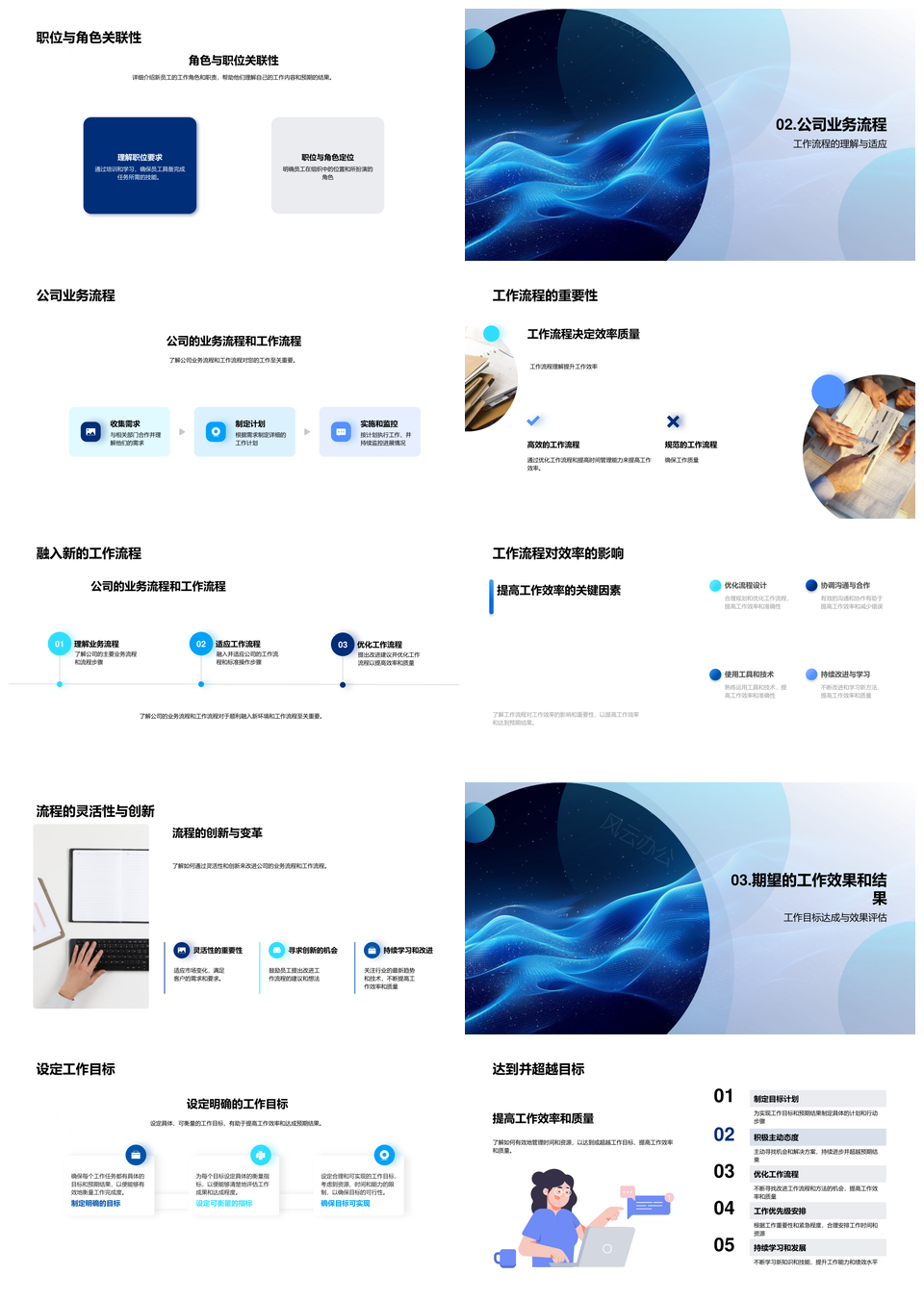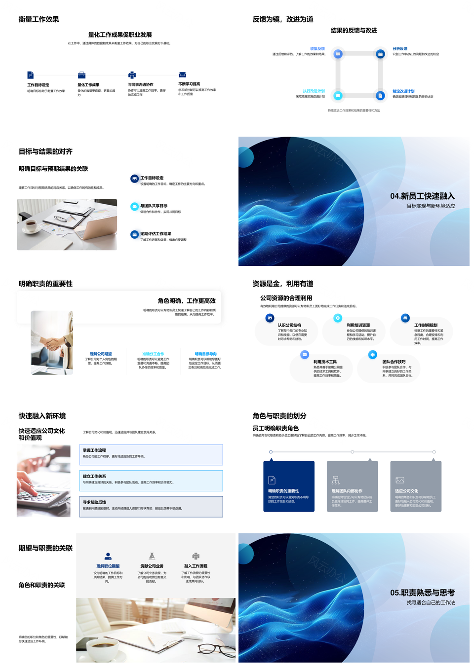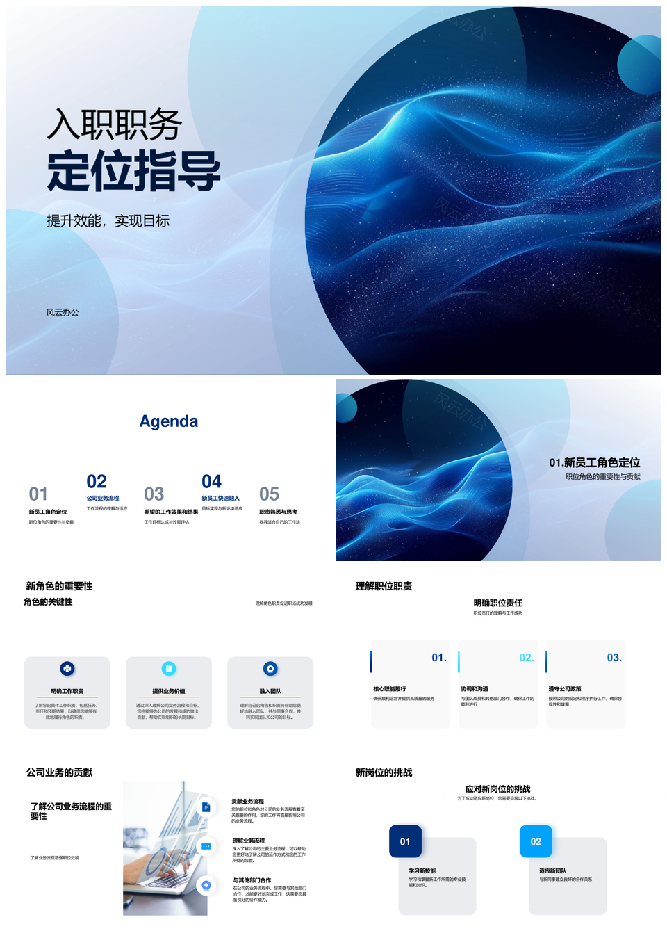 这是一张新员工入职定位培训职责流程目标效果指导PPT模板,包含新员工、入职、定位、培训、职责、流程、目标、效果、指导等主题内容,也可用作新员工入职定位培训、入职定位培训职责、定位培训职责流程、培训职责流程目标、职责流程目标效果、流程目标效果指导、新员工入职定位、入职定位培训、定位培训职责、培训职责流程、职责流程目标、流程目标效果、目标效果指导、新员工入职、新员工培训等PPT场景使用。 风云办公提供的新员工入职定位培训职责流程目标效果指导PPT模板,下载格式为pptx,一共33页,作品中文字及图均可以修改和编辑,图片更改请在作品中右键图片并更换,文字修改请直接点击文字进行修改。