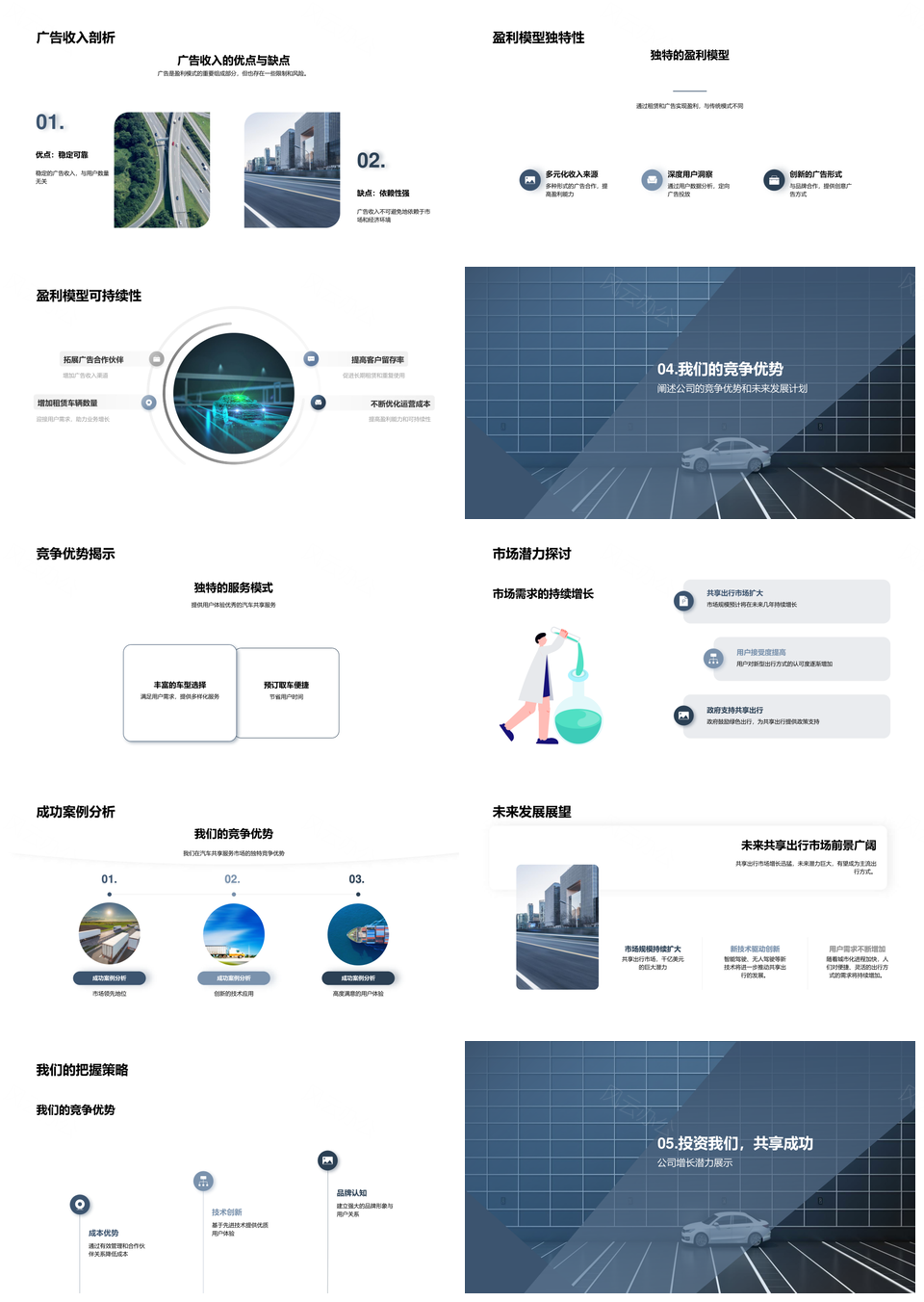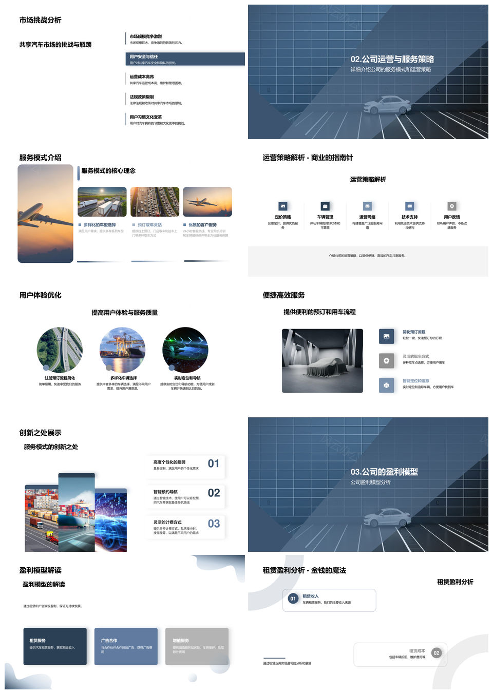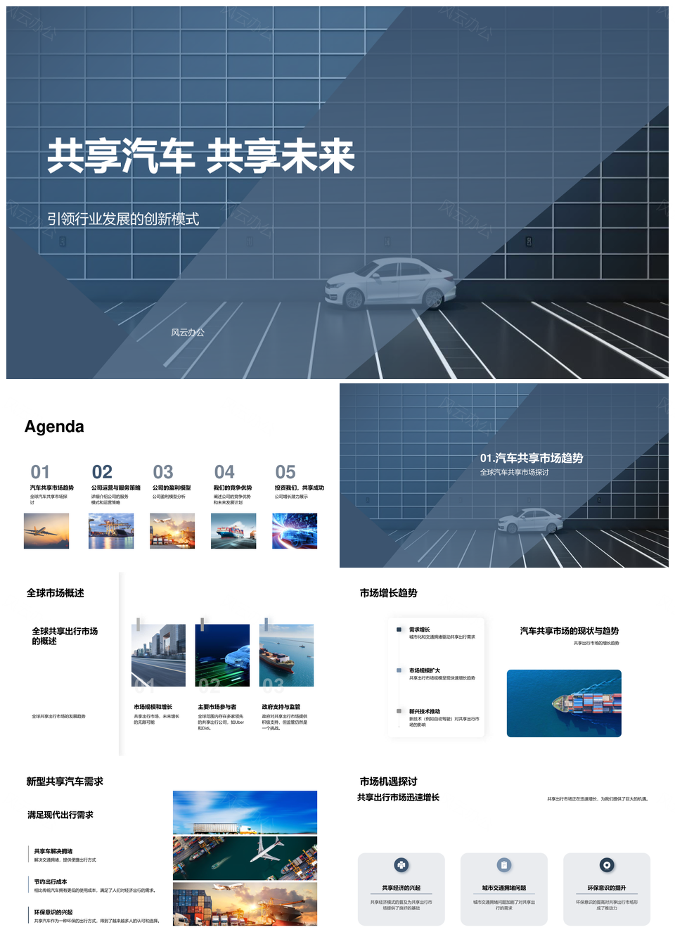 风云办公提供的共享汽车创新模式驱动全球出行趋势PPT模板,下载格式为pptx,一共33页,作品中文字及图均可以修改和编辑,图片更改请在作品中右键图片并更换,文字修改请直接点击文字进行修改。