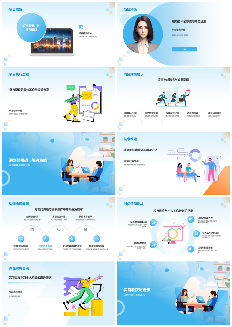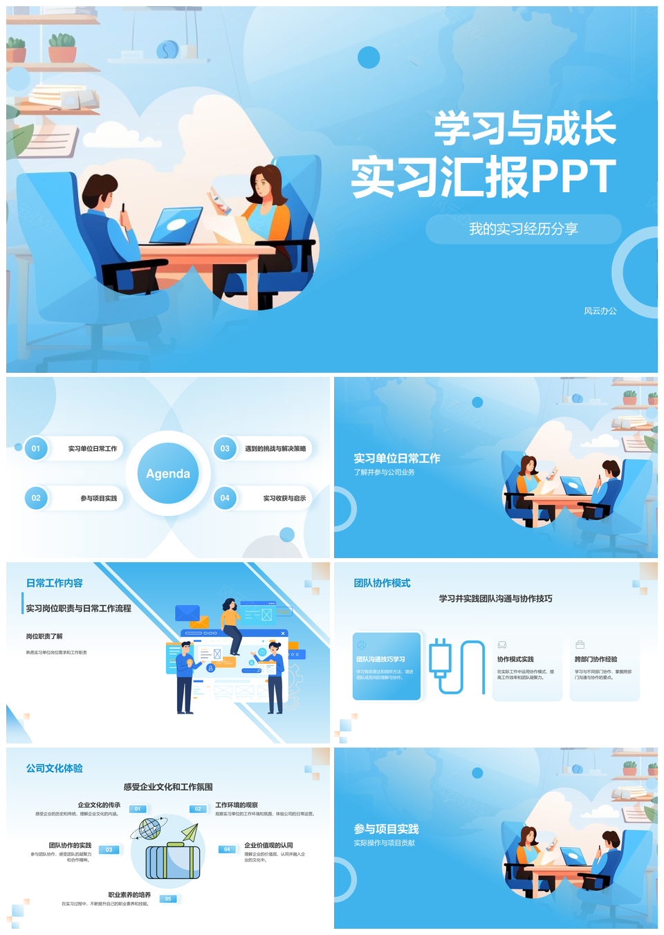 风云办公提供的蓝色插画实习期工作学习收获汇报展示PPT模板,下载格式为pptx,一共21页,作品中文字及图均可以修改和编辑,图片更改请在作品中右键图片并更换,文字修改请直接点击文字进行修改。