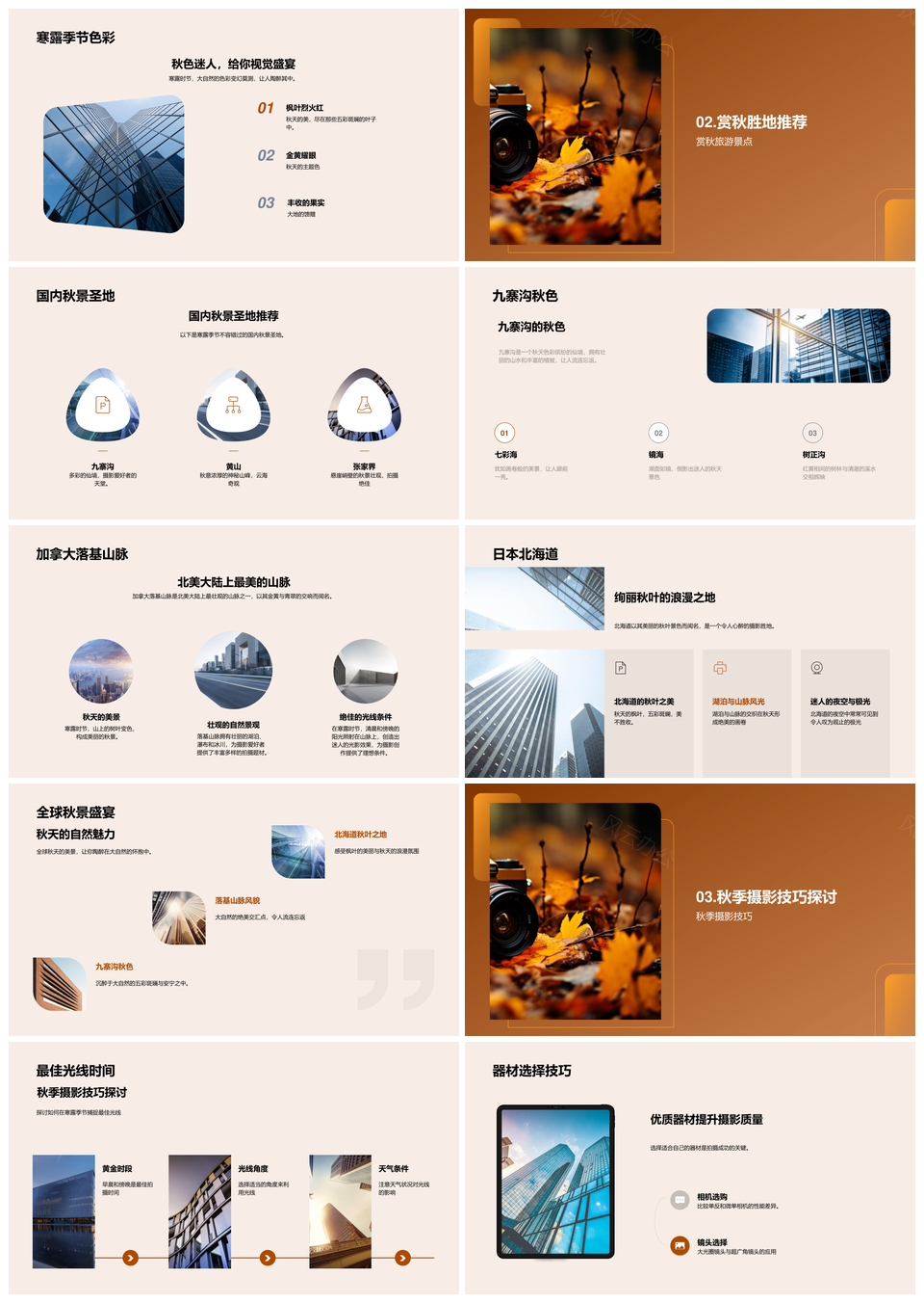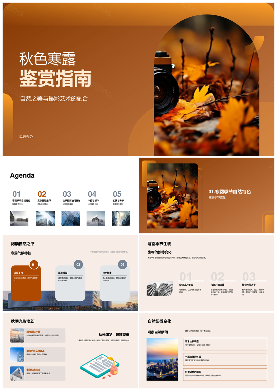 风云办公提供的寒露秋色摄影九寨沟加拿大北海道赏秋PPT模板,下载格式为pptx,一共33页,作品中文字及图均可以修改和编辑,图片更改请在作品中右键图片并更换,文字修改请直接点击文字进行修改。