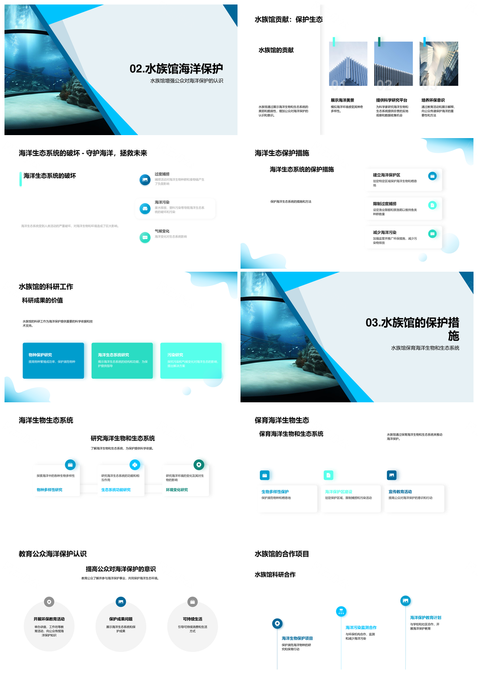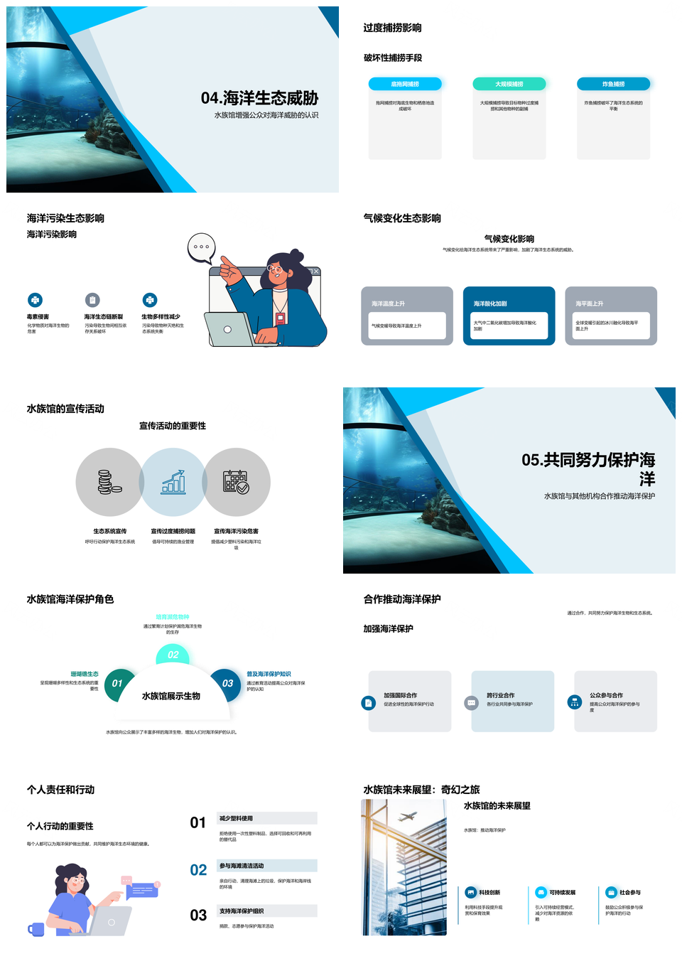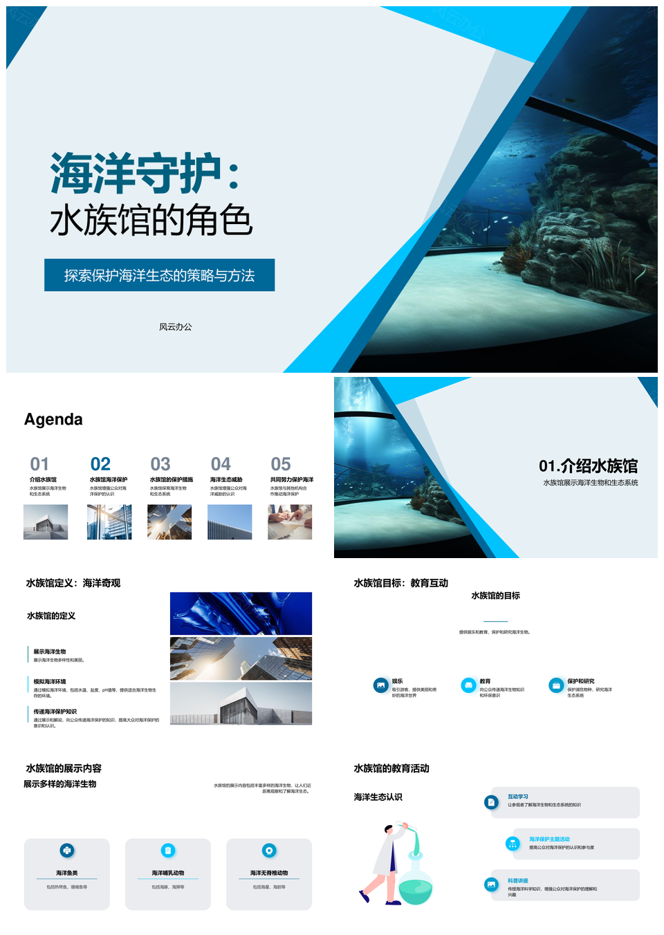 风云办公提供的水族馆守护海洋责任教育普及PPT模板,下载格式为pptx,一共28页,作品中文字及图均可以修改和编辑,图片更改请在作品中右键图片并更换,文字修改请直接点击文字进行修改。