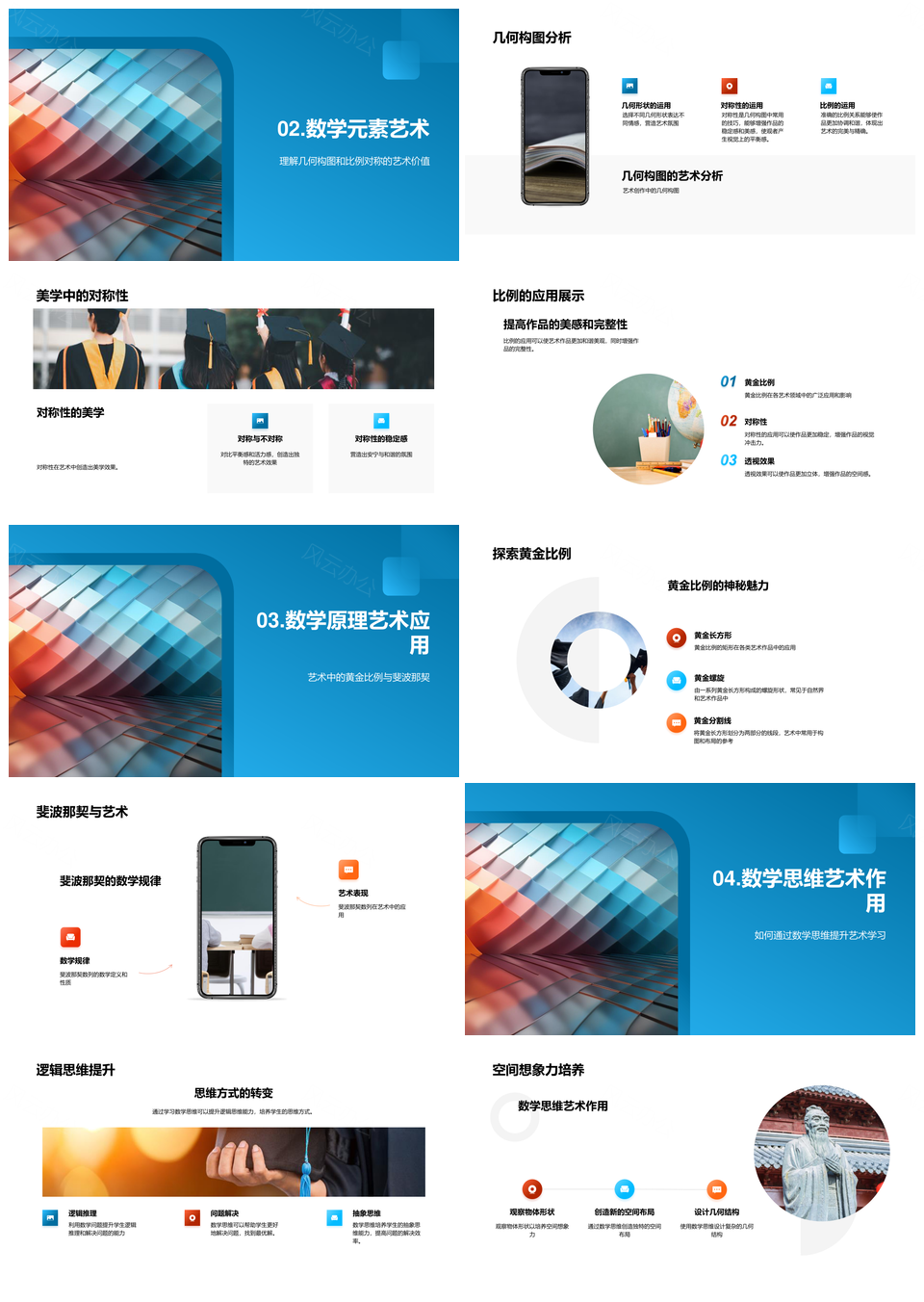 风云办公提供的艺术数学黄金比例几何美学应用PPT模板,下载格式为pptx,一共23页,作品中文字及图均可以修改和编辑,图片更改请在作品中右键图片并更换,文字修改请直接点击文字进行修改。