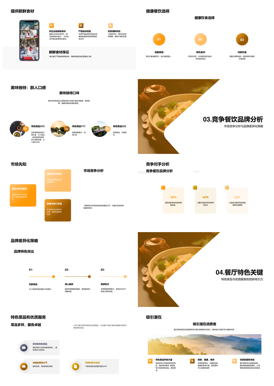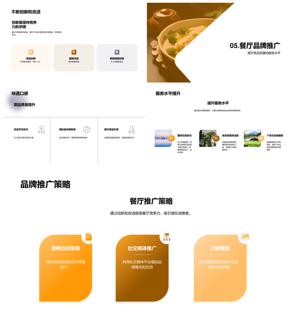 这是一张餐厅经理推广特色菜品优质服务吸引餐饮旅游消费者PPT模板,包含餐厅经理、推广、特色菜品、优质服务、吸引、餐饮旅游消费者等主题内容,也可用作餐厅经理推广特色菜品、推广特色菜品优质服务、特色菜品优质服务吸引、优质服务吸引餐饮旅游、吸引餐饮旅游消费者、餐厅经理特色优质服务、经理推广餐饮旅游消费者、特色菜品吸引旅游消费者、餐厅优质服务餐饮旅游、推广餐饮旅游消费者、餐厅特色菜品优质服务、经理推广优质服务、餐饮旅游消费者吸引、特色菜品餐饮旅游、优质服务吸引消费者等PPT场景使用。 风云办公提供的餐厅经理推广特色菜品优质服务吸引餐饮旅游消费者PPT模板,下载格式为pptx,一共23页,作品中文字及图均可以修改和编辑,图片更改请在作品中右键图片并更换,文字修改请直接点击文字进行修改。