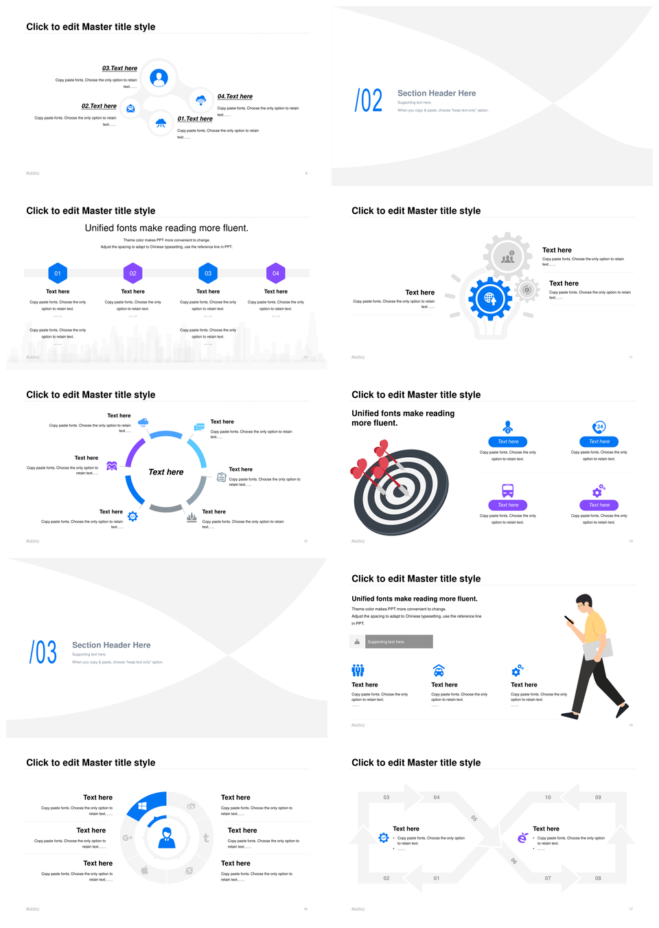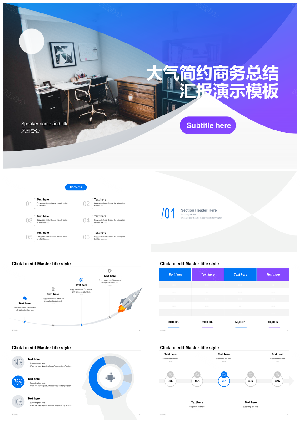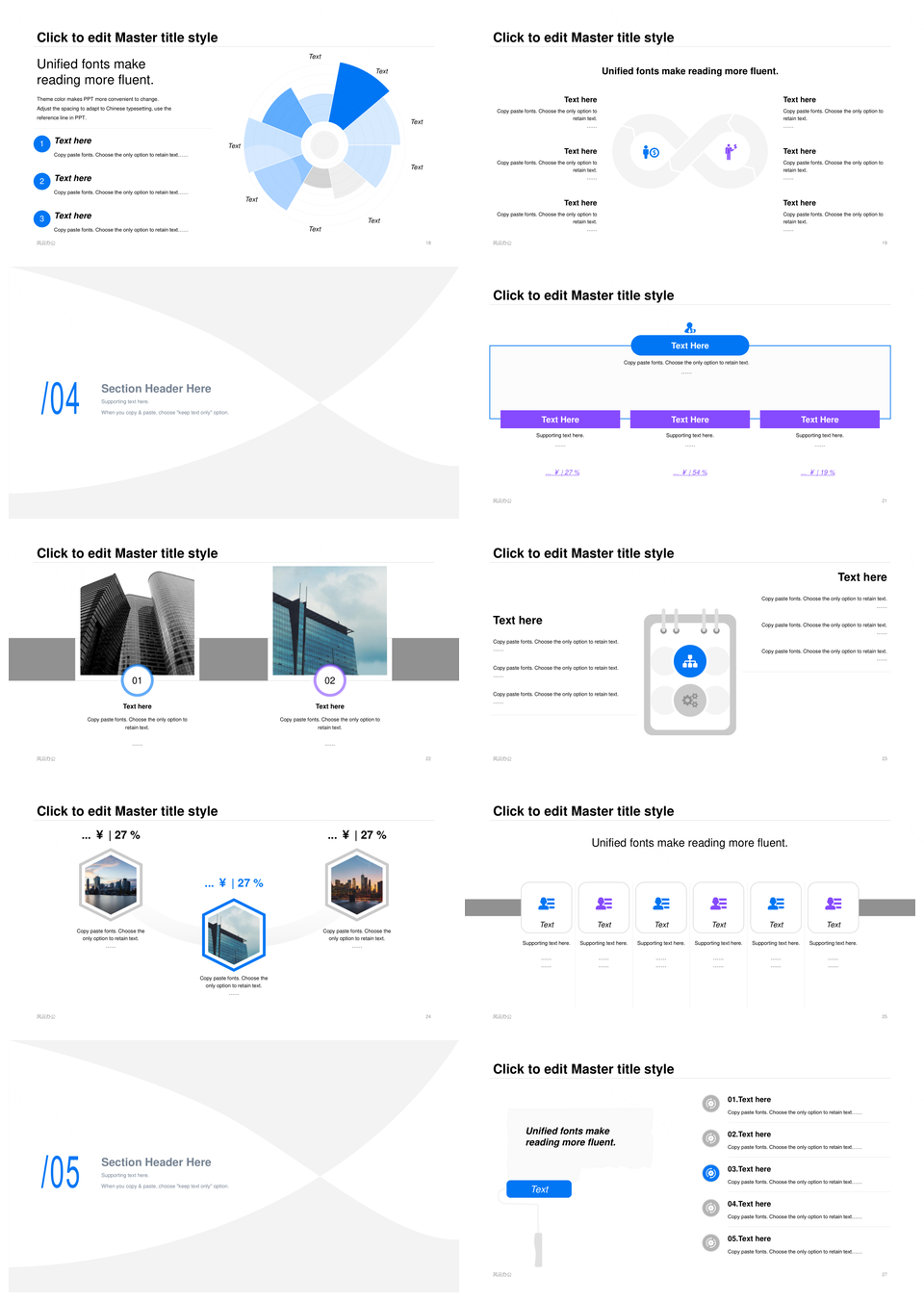 这款商务风PPT模板以冷色调为视觉核心,浅蓝至藏蓝的层次渐变传递专业稳定感,搭配灰紫与霓虹紫作为点缀色,平衡理性与创意。全模板采用极简设计逻辑,信息层级通过色块对比与留白自然划分,确保数据可视化与文本结构清晰可读。页面涵盖提案框架、图表架构、多场景导航页等实用模块,图表与图标均支持灵活配色,适配行业峰会、产品路演、团队复盘等职场场景。无衬线字体的选择与低饱和度色系配合,避免视觉干扰,提升信息传达效率,助力用户精准呈现业务内核。