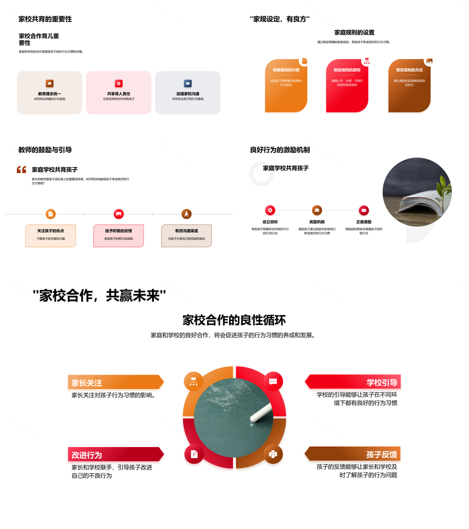 风云办公提供的家校共育培养孩子良好行为习惯PPT模板,下载格式为pptx,一共33页,作品中文字及图均可以修改和编辑,图片更改请在作品中右键图片并更换,文字修改请直接点击文字进行修改。