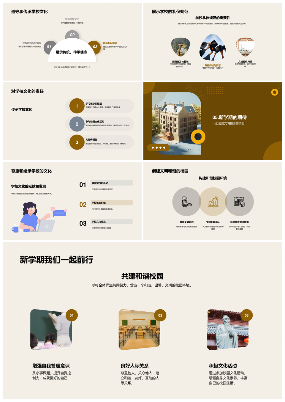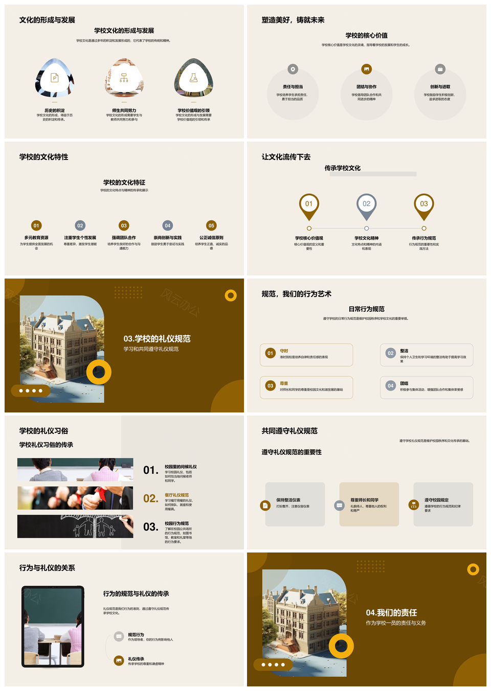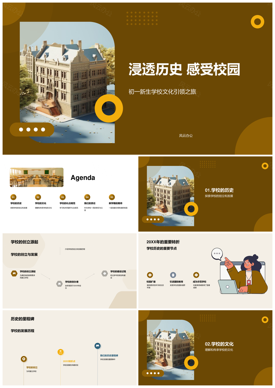风云办公提供的校史传承礼筑心魂史蕴校园PPT模板,下载格式为pptx,一共25页,作品中文字及图均可以修改和编辑,图片更改请在作品中右键图片并更换,文字修改请直接点击文字进行修改。