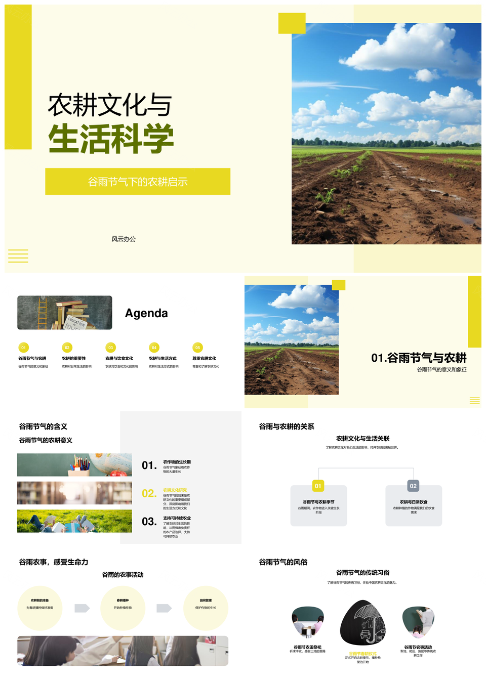 风云办公提供的谷雨农耕春耕与生活科学饮食PPT模板,下载格式为pptx,一共28页,作品中文字及图均可以修改和编辑,图片更改请在作品中右键图片并更换,文字修改请直接点击文字进行修改。