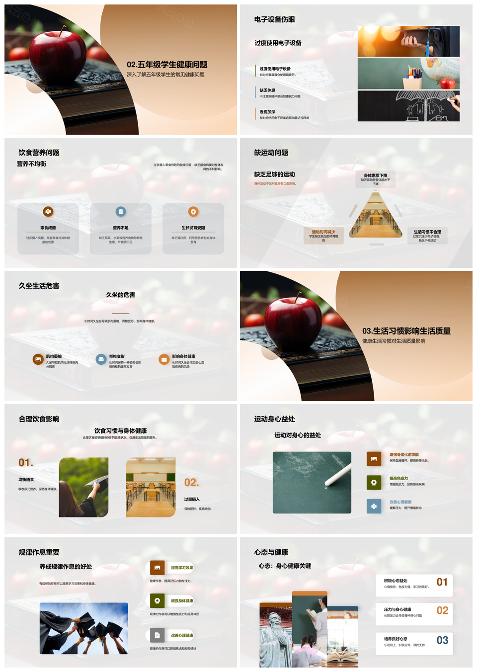 五年级学生健康生活快乐成长健康教育视力饮食运动苹果PPT模板推荐