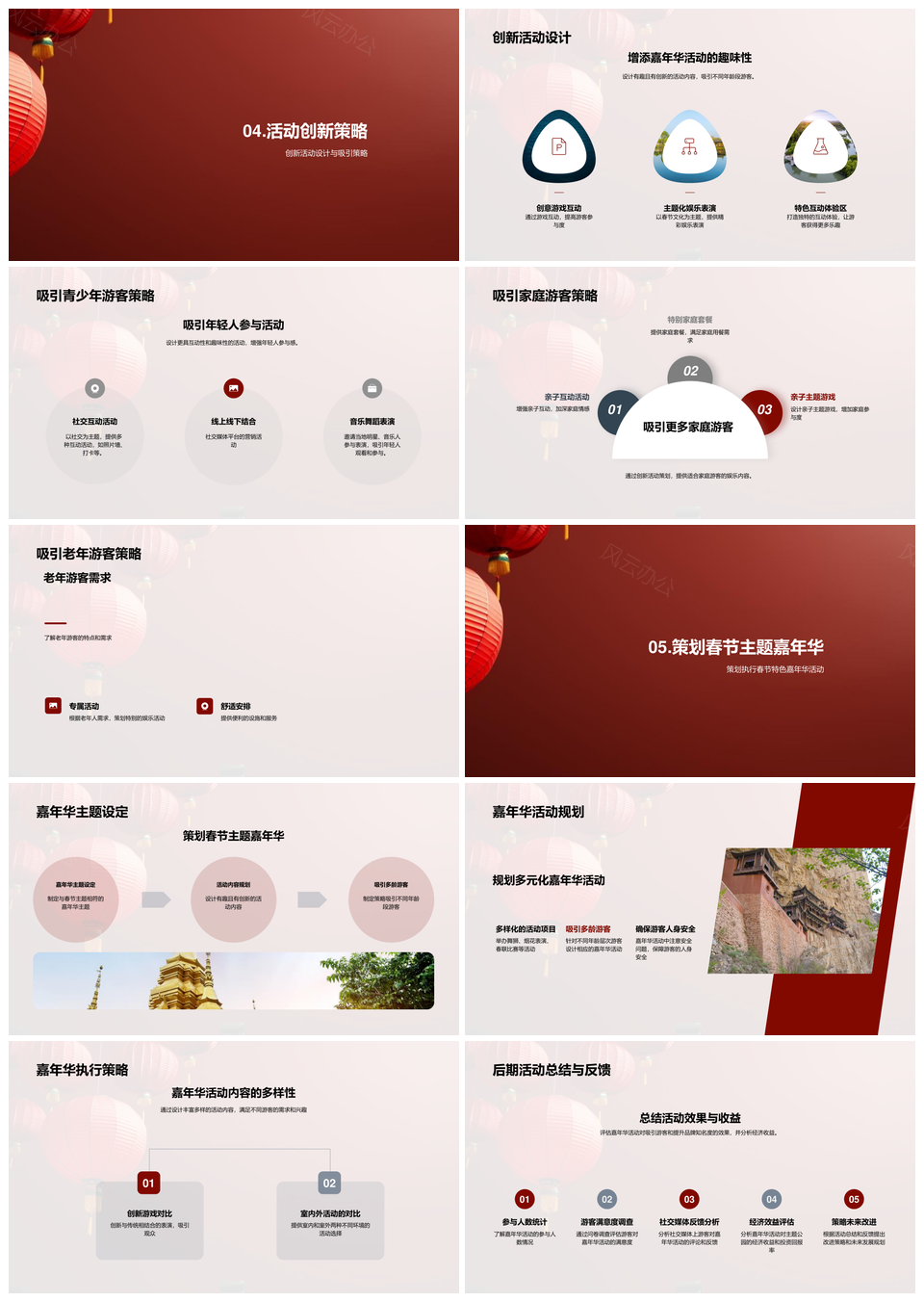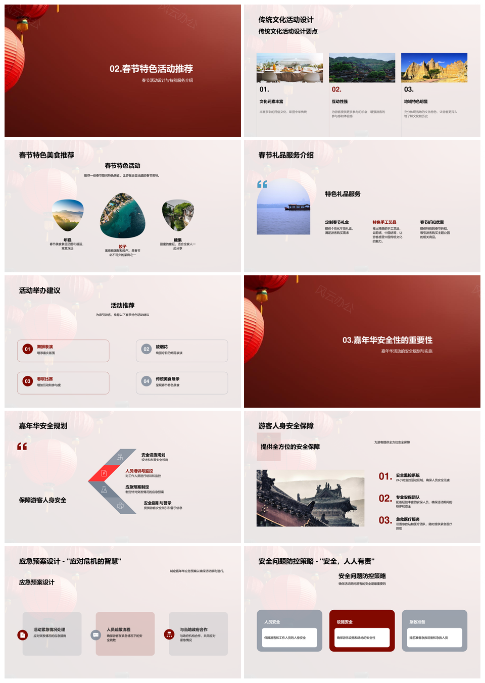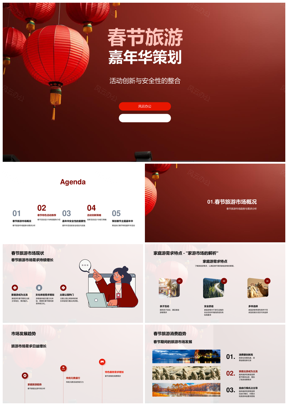 这是一张春节旅游嘉年华创新安全家庭游传统美食灯笼PPT模板,包含春节、旅游、嘉年华、创新、安全、家庭游、传统、美食、灯笼等主题内容,也可用作春节旅游嘉年华创新、春节旅游安全家庭游、嘉年华创新传统美食、安全家庭游传统美食灯笼、传统美食灯笼春节旅游、家庭游传统美食灯笼、春节安全家庭游创新、创新安全家庭游灯笼、春节嘉年华传统美食、春节旅游嘉年华灯笼、旅游嘉年华创新安全、安全家庭游传统美食、春节传统美食灯笼、家庭游传统美食、美食灯笼春节等PPT场景使用。 风云办公提供的春节旅游嘉年华创新安全家庭游传统美食灯笼PPT模板,下载格式为pptx,一共28页,作品中文字及图均可以修改和编辑,图片更改请在作品中右键图片并更换,文字修改请直接点击文字进行修改。